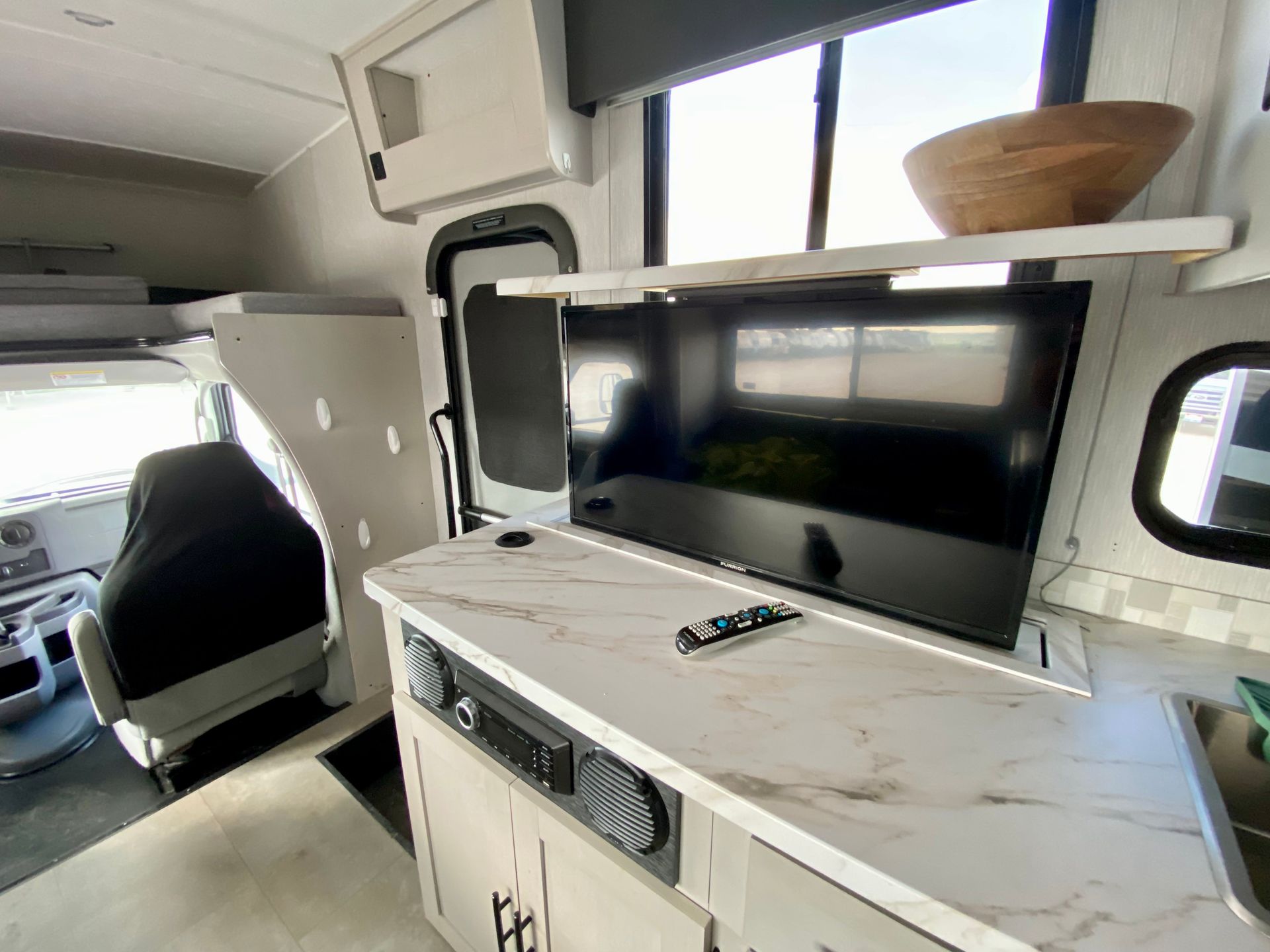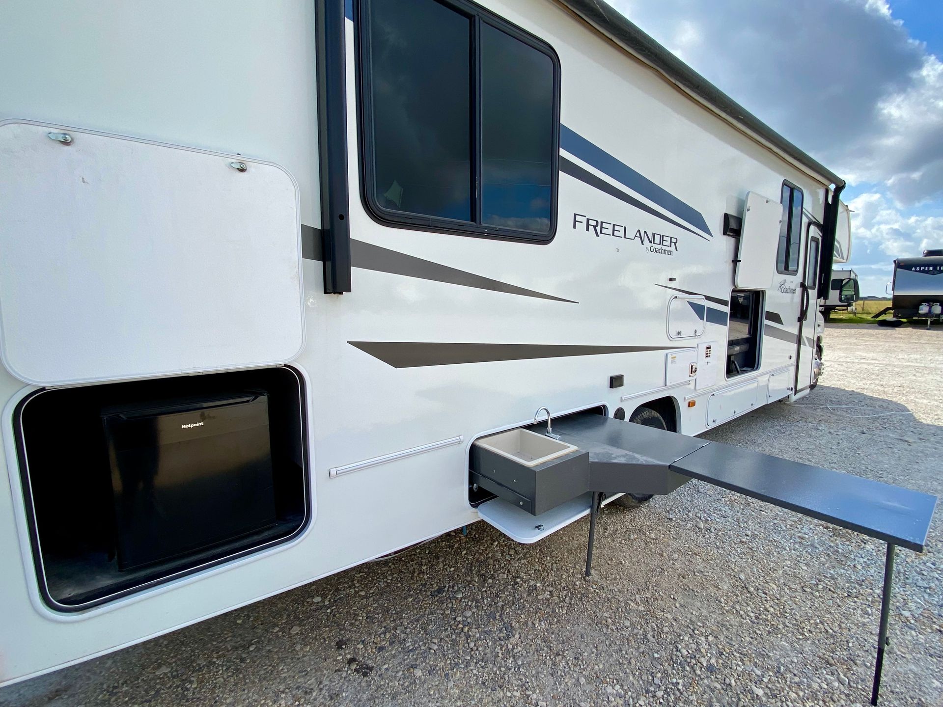 Inside, the Freelander comfortably sleeps up to six people. There’s a private rear bedroom with a cozy queen bed, a large over-cab bunk, and a convertible dinette that doubles as an additional sleeping area. The open floor plan makes great use of space, giving you room to relax and enjoy time indoors.