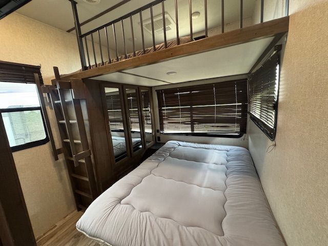 This 36-foot Chaparral fifth wheel features two bedrooms for added privacy and comfort. The first bedroom is a queen master, while the second bedroom includes two full bunks, perfect for families or guests. The full kitchen and bathroom offer all the amenities you need, and there's a loft with a full-size bed for additional sleeping space. Whether for relaxation or work, this fifth wheel is designed to accommodate your needs.