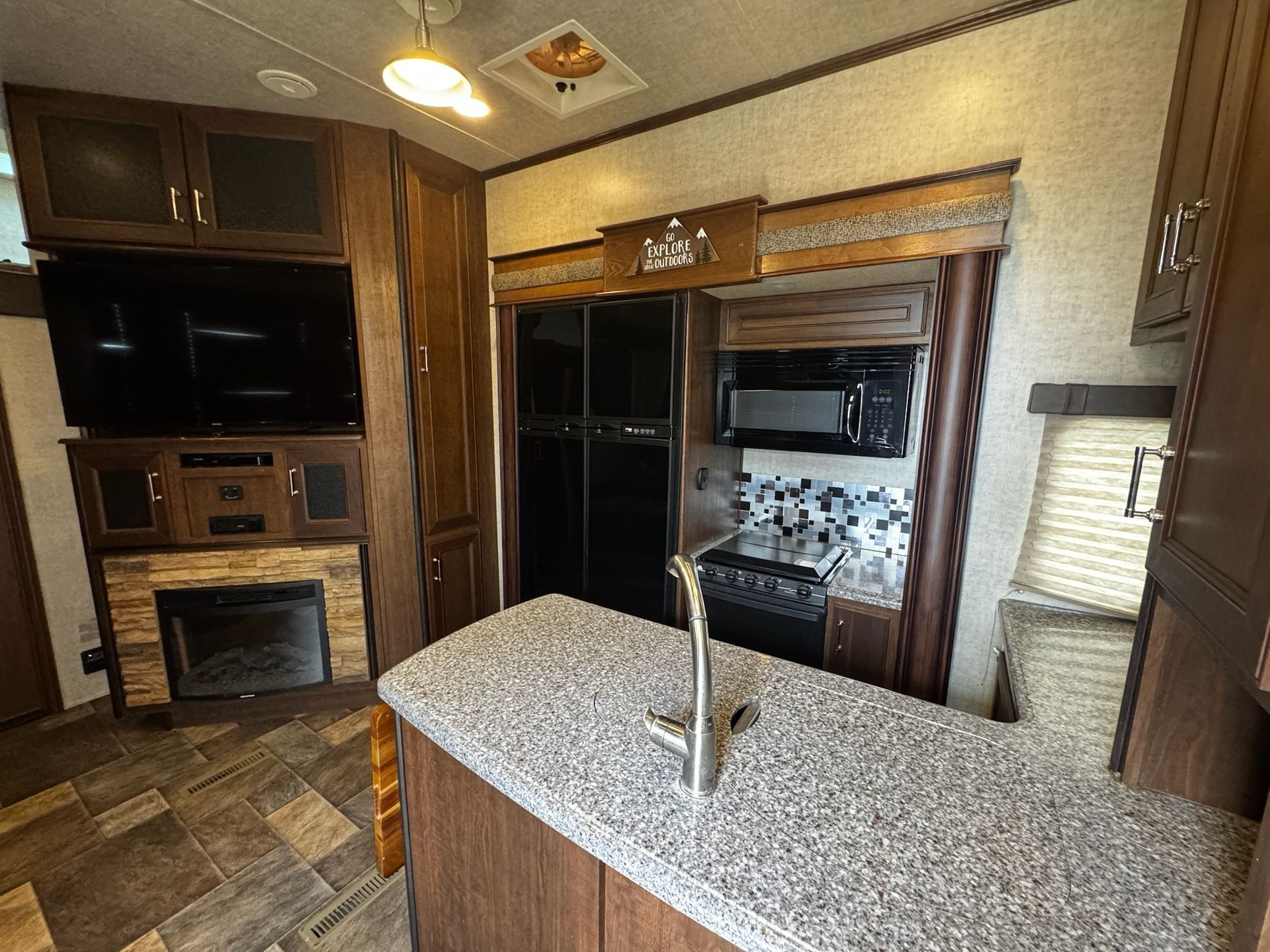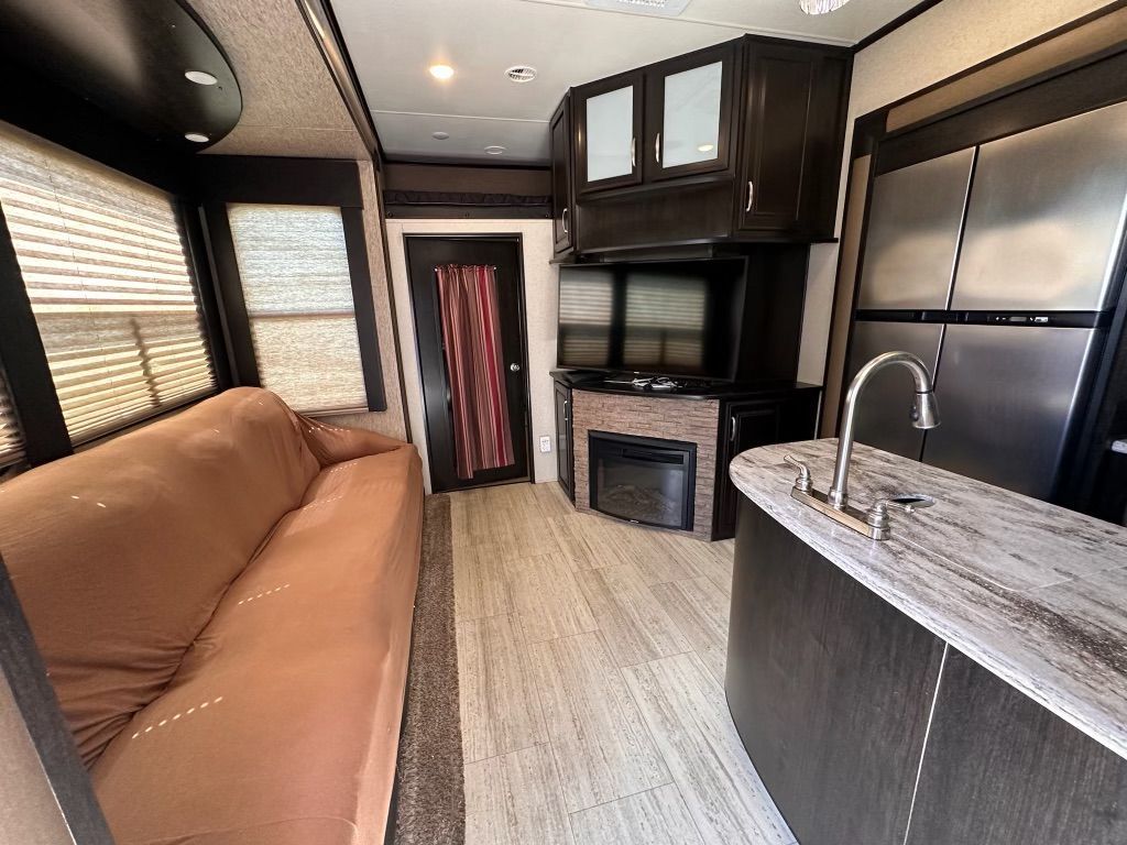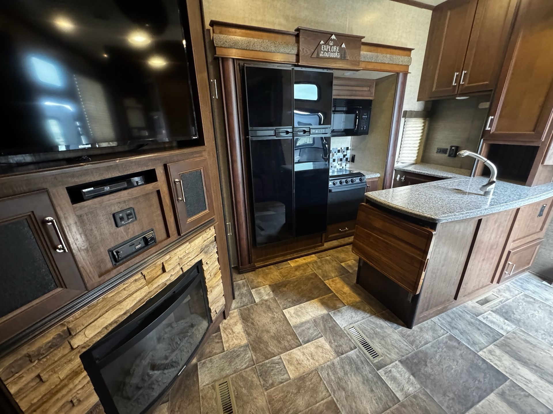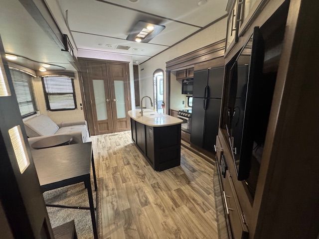This luxurious open living fifth wheel can easily become you only home! Private rear king bedroom with large full bathroom,. Living room with TV and fireplace. Two pullout sleeper sofas and two recliners. Kitchen rivals anyone's with residential fridge, cabinet space galore, and plenty of counter space. Washer and dryer included!