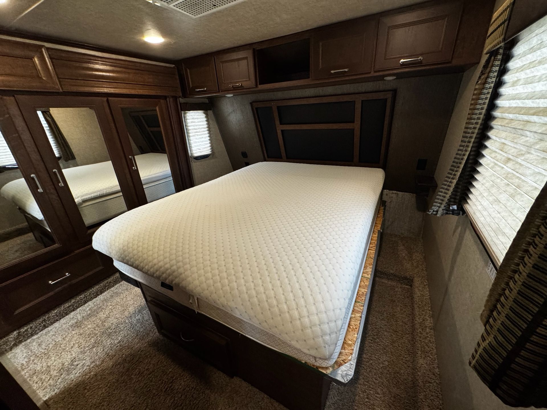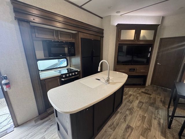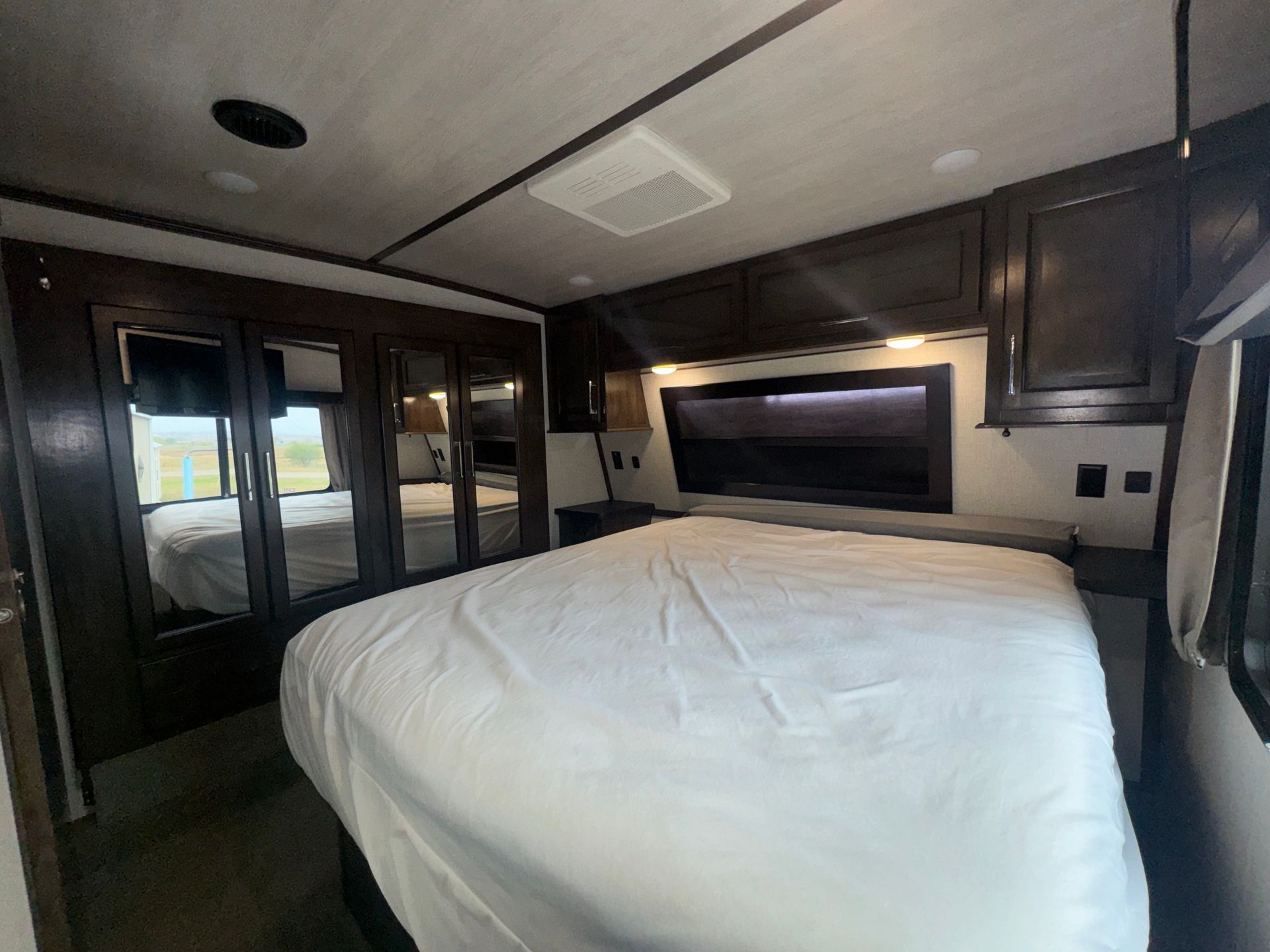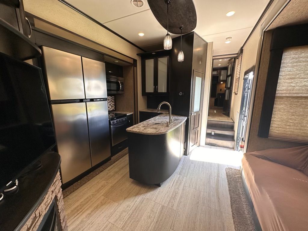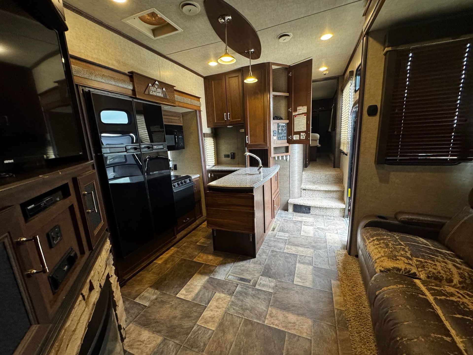 This luxurious open living fifth wheel can easily become you only home! Private rear king bedroom with large full bathroom,. Living room with TV and fireplace. Two pullout sleeper sofas and two recliners. Kitchen rivals anyone's with residential fridge, cabinet space galore, and plenty of counter space. Washer and dryer included!