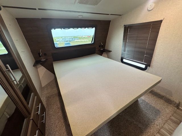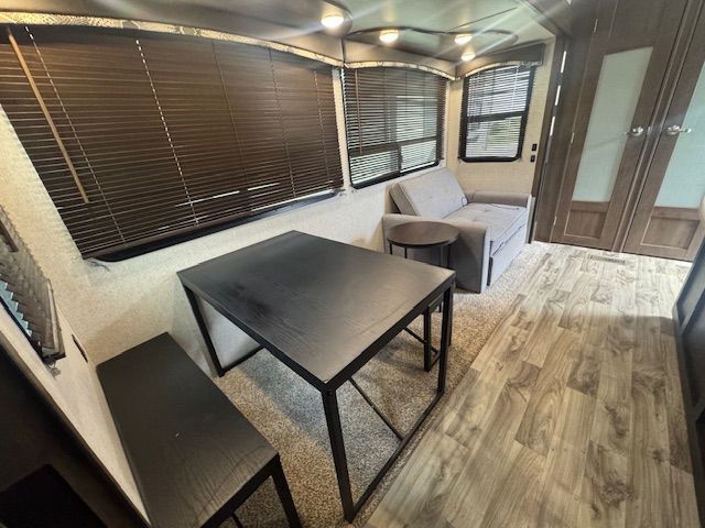 The 2022 37-foot Flagstaff fifth wheel offers a spacious and comfortable layout with three slide-outs. The king master bedroom provides a restful retreat, and the open living area is perfect for relaxing or entertaining. The trailer features one full bath and a corner kitchen, making meal prep convenient and easy. The opposing slides in the kitchen and living area create a roomy and inviting space, complete with a dinette and two recliners for added comfort. This fifth wheel combines both luxury and practicality for the perfect getaway.