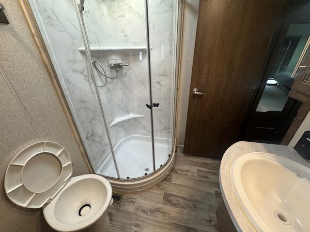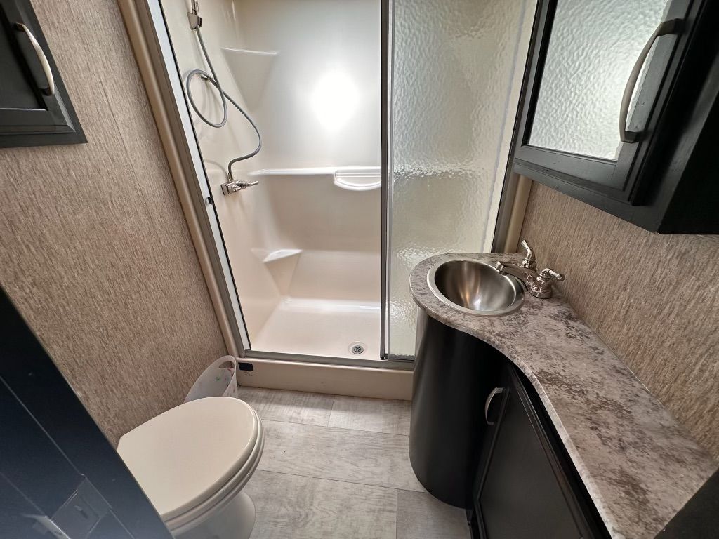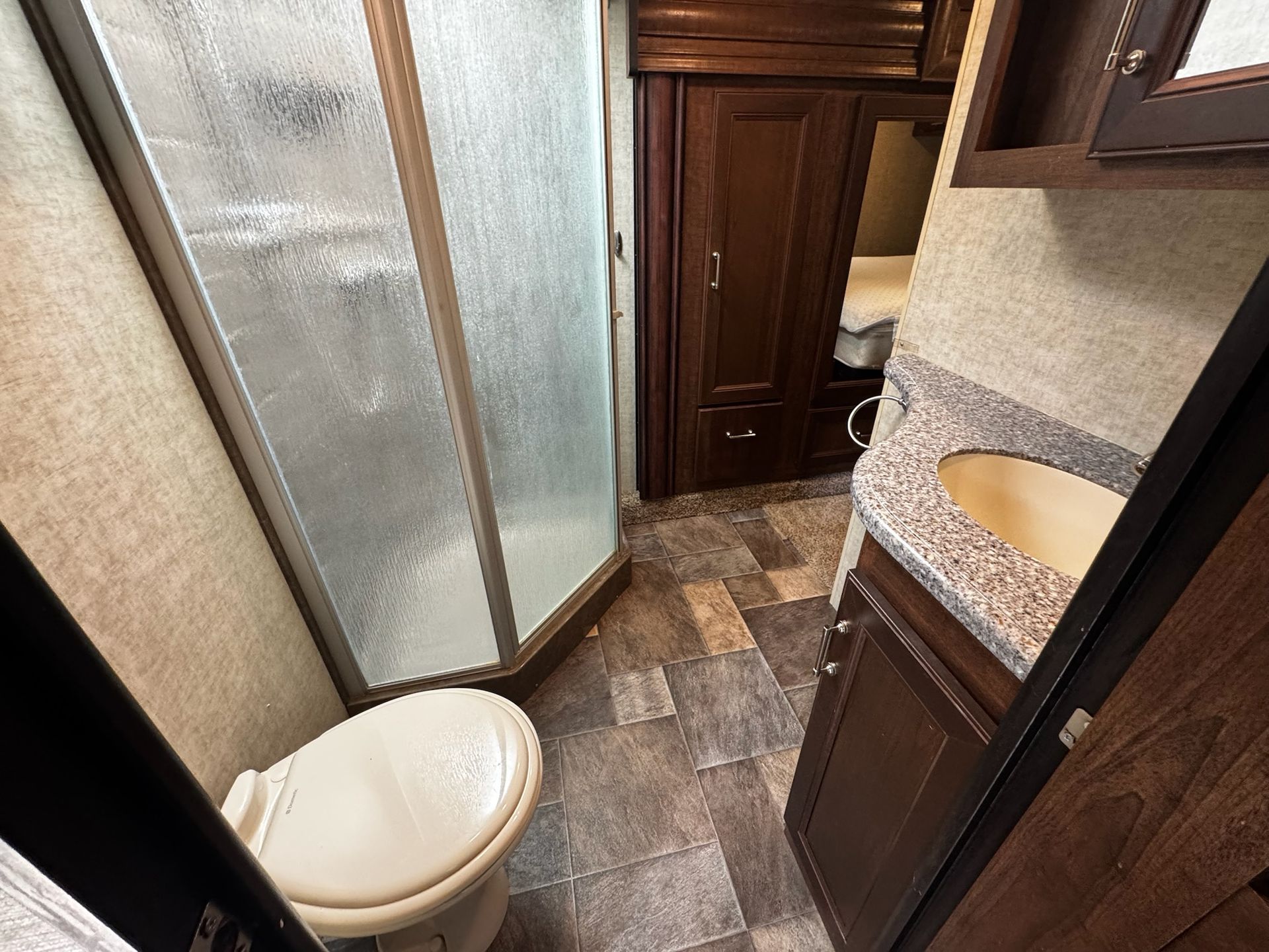 2024 Forest River Wildwood Heritage 375FAM is a spacious and versatile fifth wheel designed with families in mind. Its thoughtful floorpan combines comfort, convenience, and functionality, making it perfect for weekend getaways, extended trips, or full-time adventures. Inside, you'll find a bright and open living area with large slide-outs, comfortable seating, and an entertainment center for relaxing evenings. The full kitchen is equipped with solid-surface countertops, a residential-style refrigerator, stainless steel appliances, and ample cabinetry for all your cooking needs. A freestanding dinette offers a dedicated space for family meals or game nights. The private front master suite features a queen bed, wardrobe storage, and direct access to a full bathroom with a spacious shower and modern fixtures.