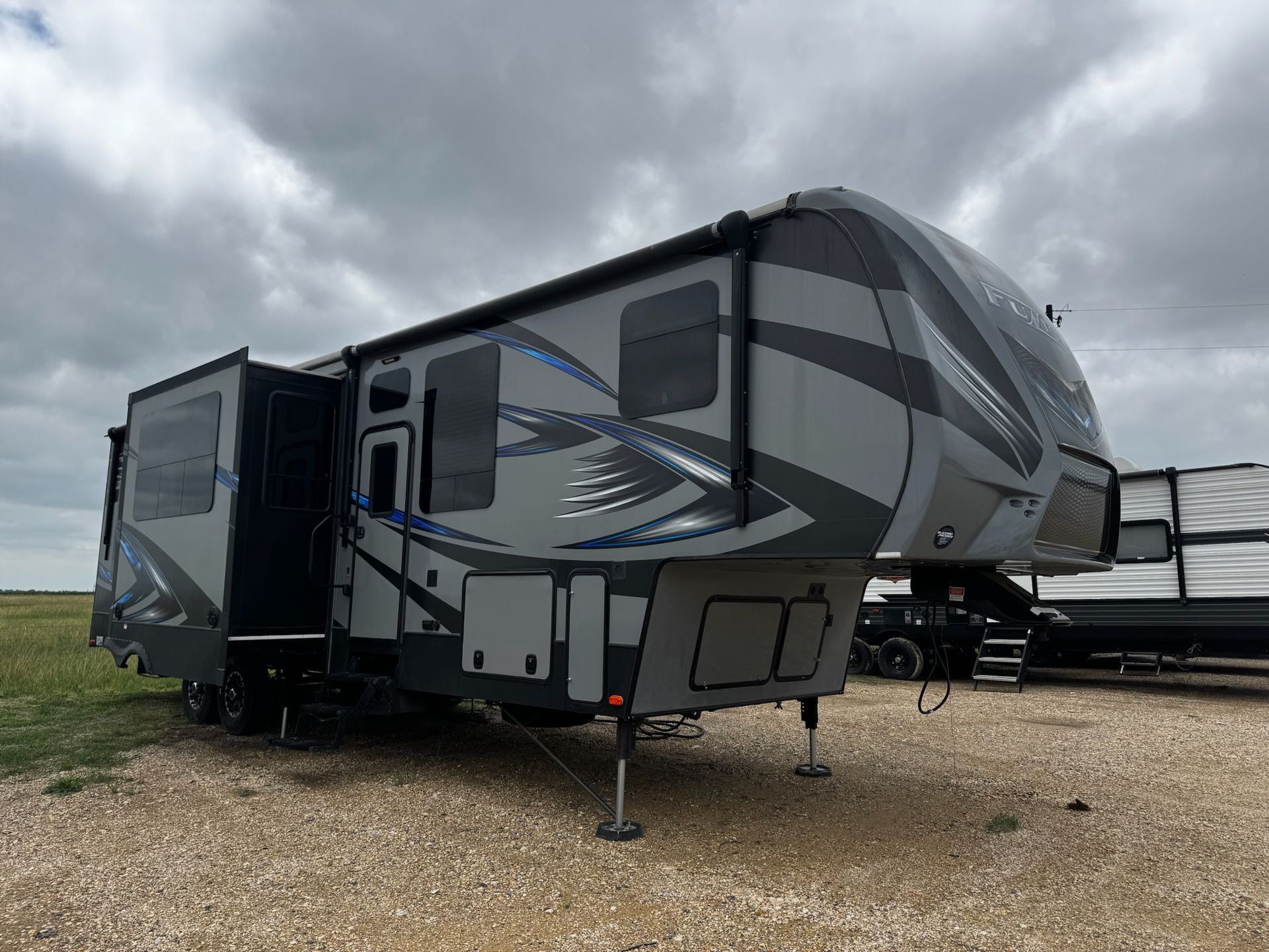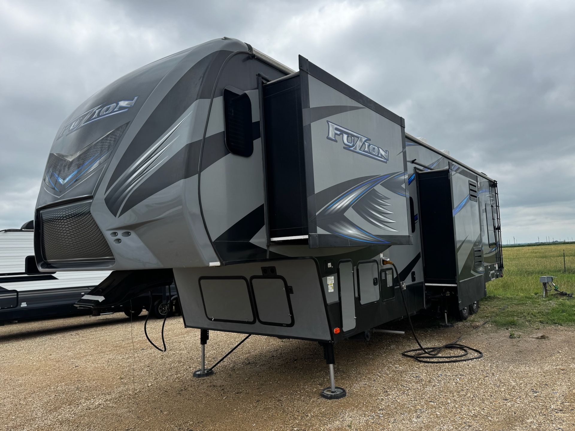The Keystone Fuzion toy hauler is designed for adventure and comfort. It features a king master bedroom for a restful retreat, along with two queen bunks in the convertible garage, offering flexible sleeping arrangements. The garage area also includes a convertible sofa with air mattress support, providing additional sleeping space when needed. Equipped with an onboard generator, this toy hauler ensures you have power wherever you go. Perfect for those seeking both comfort and versatility on the road.