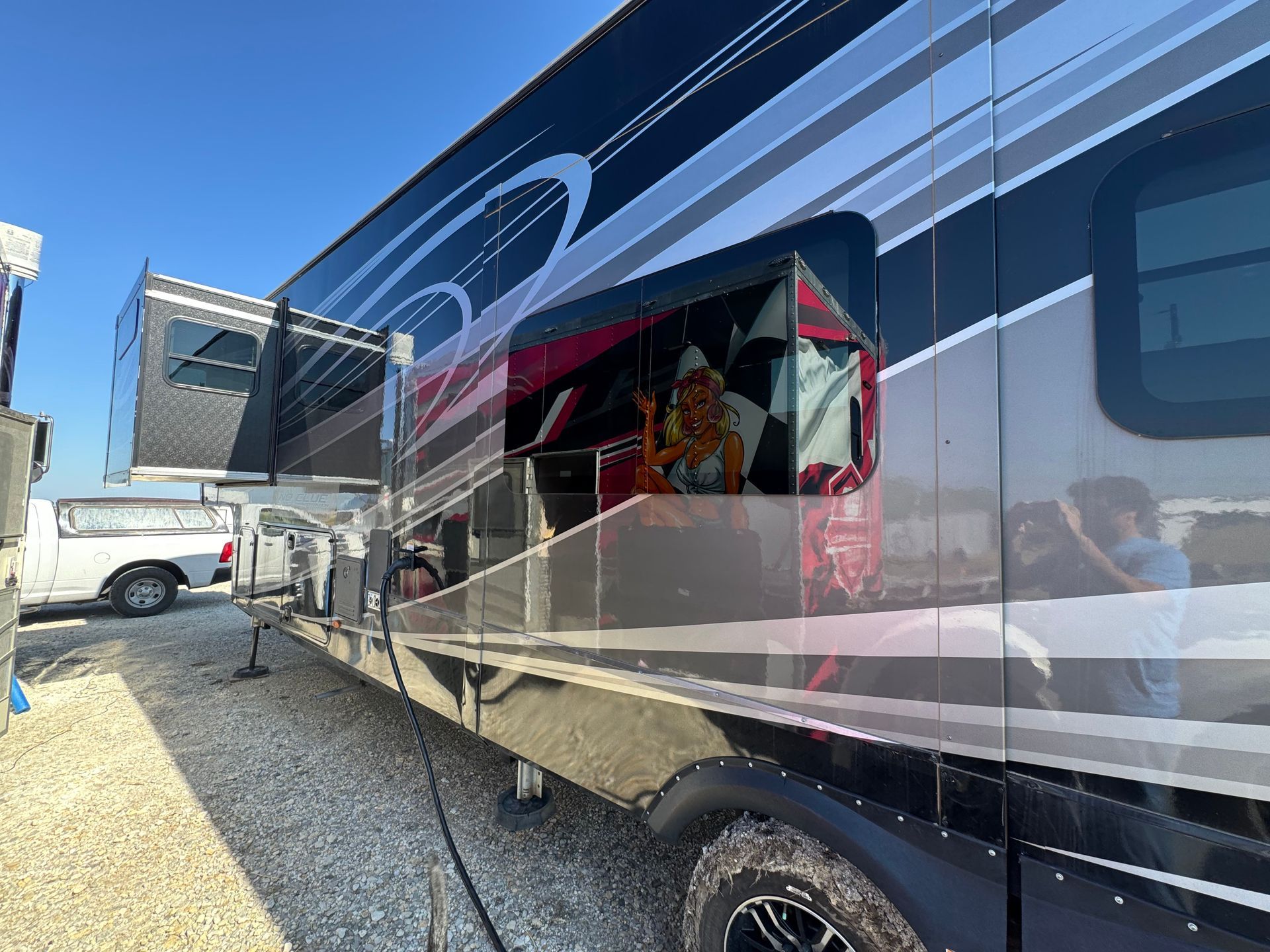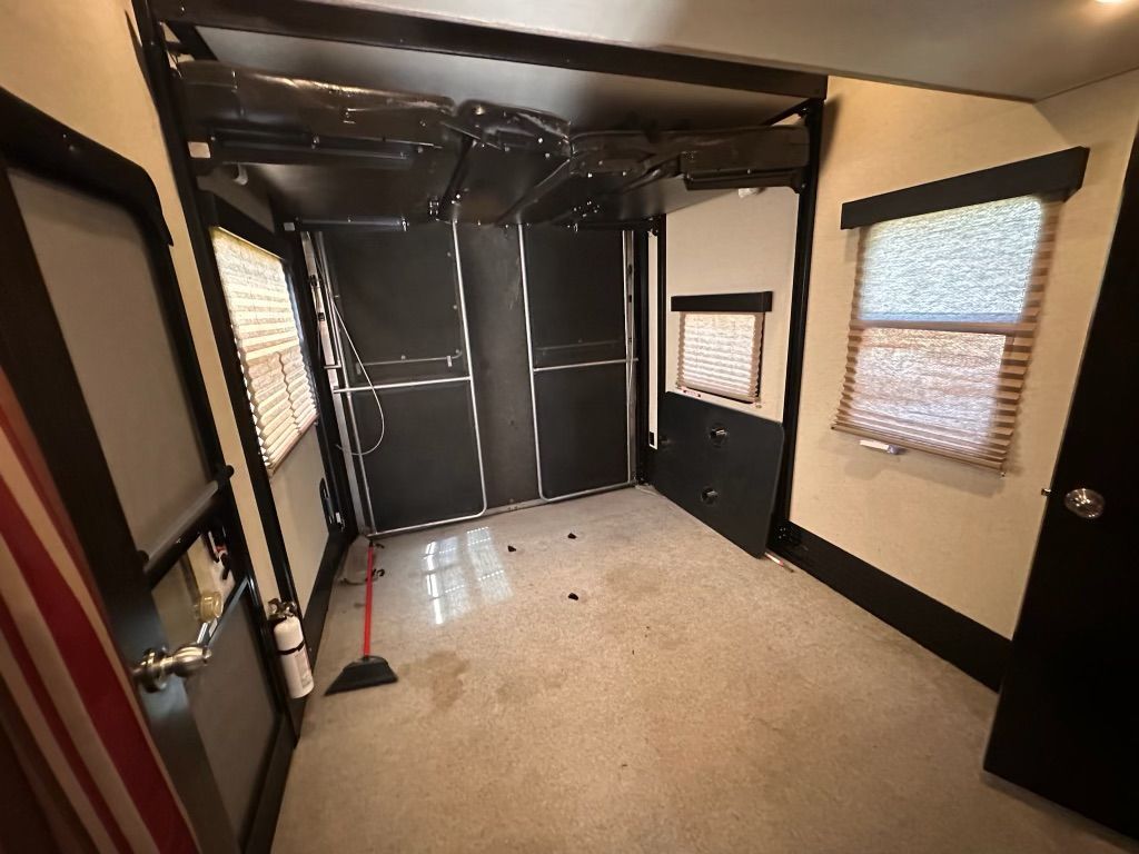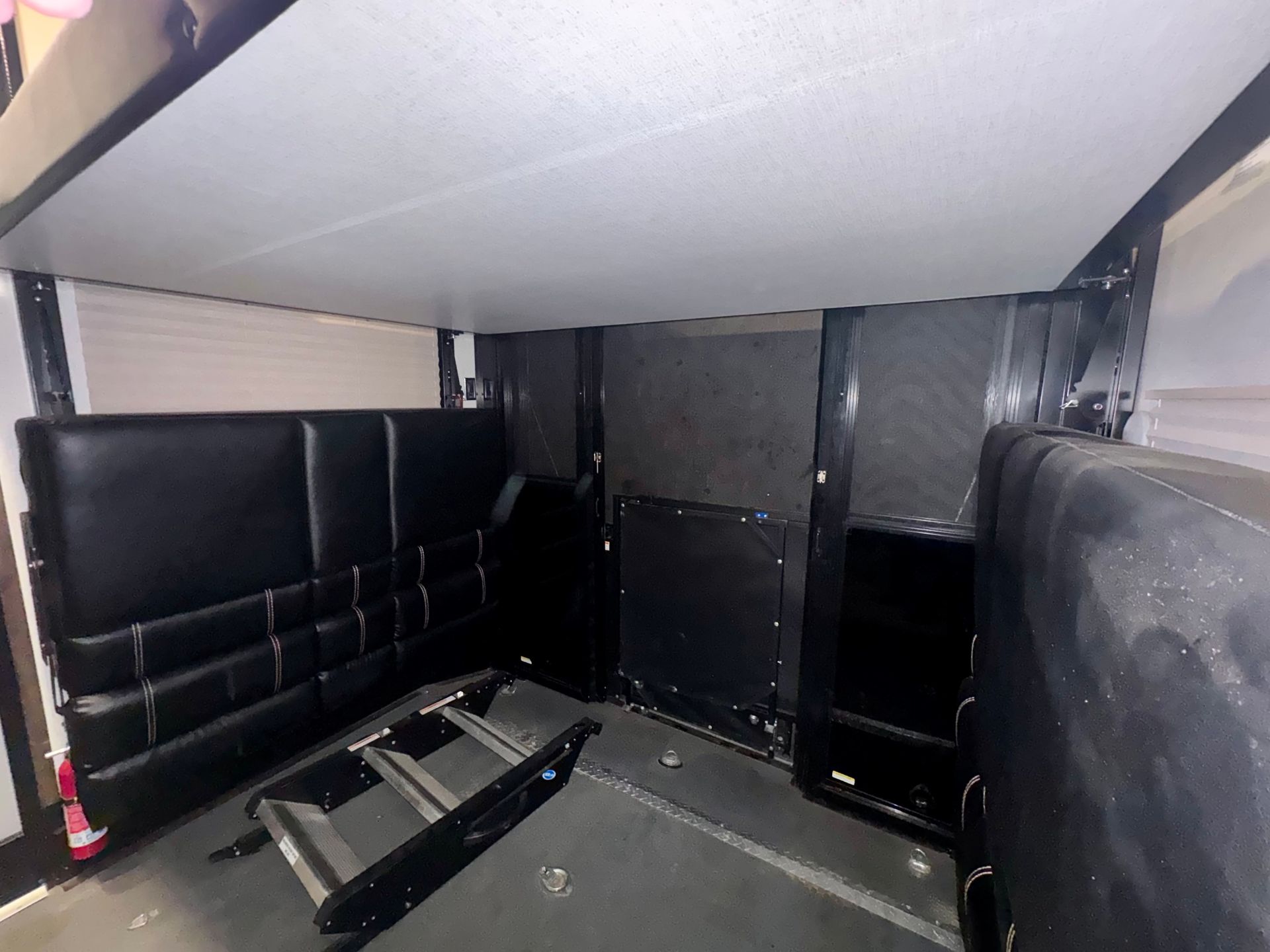 This 40-foot Cameo fifth wheel offers a spacious, open living area with four slide-outs that create an incredibly roomy interior. The king master bedroom features a fireplace and a smart TV, making it a perfect retreat for relaxation. The master bath is large and luxurious, providing comfort and privacy. The expansive living and kitchen areas are perfect for gatherings, with plenty of space to entertain or unwind. This fifth wheel offers the perfect combination of luxury and functionality, ideal for use as a green room or mobile retreat.