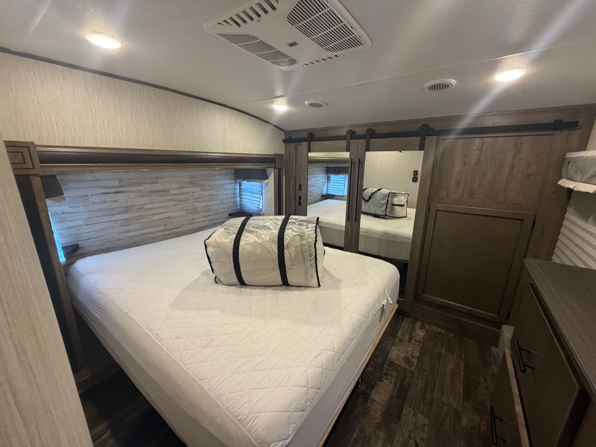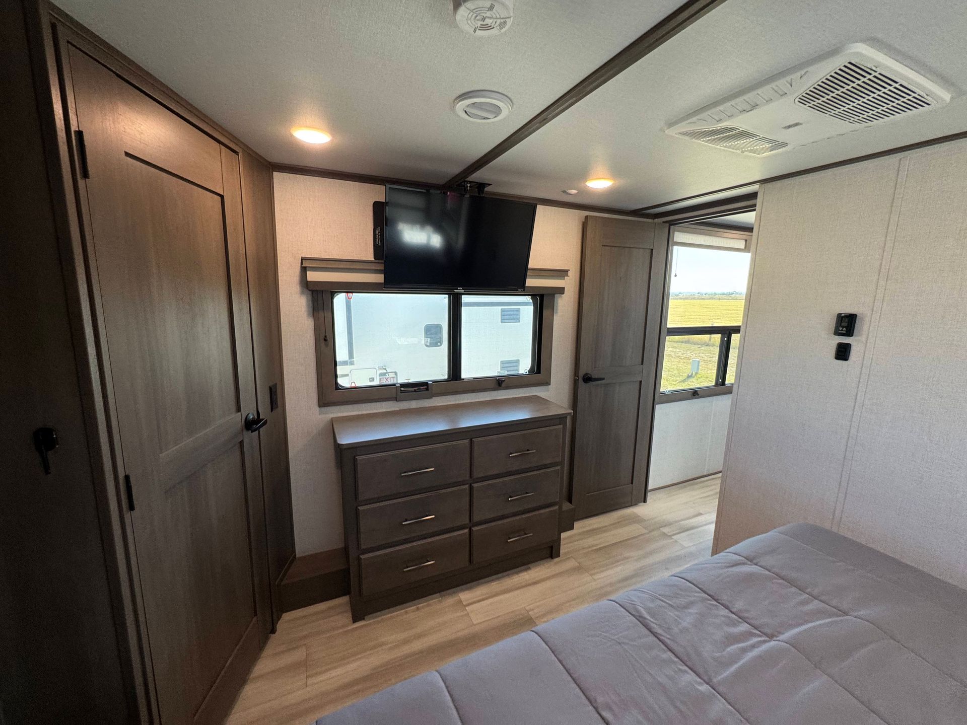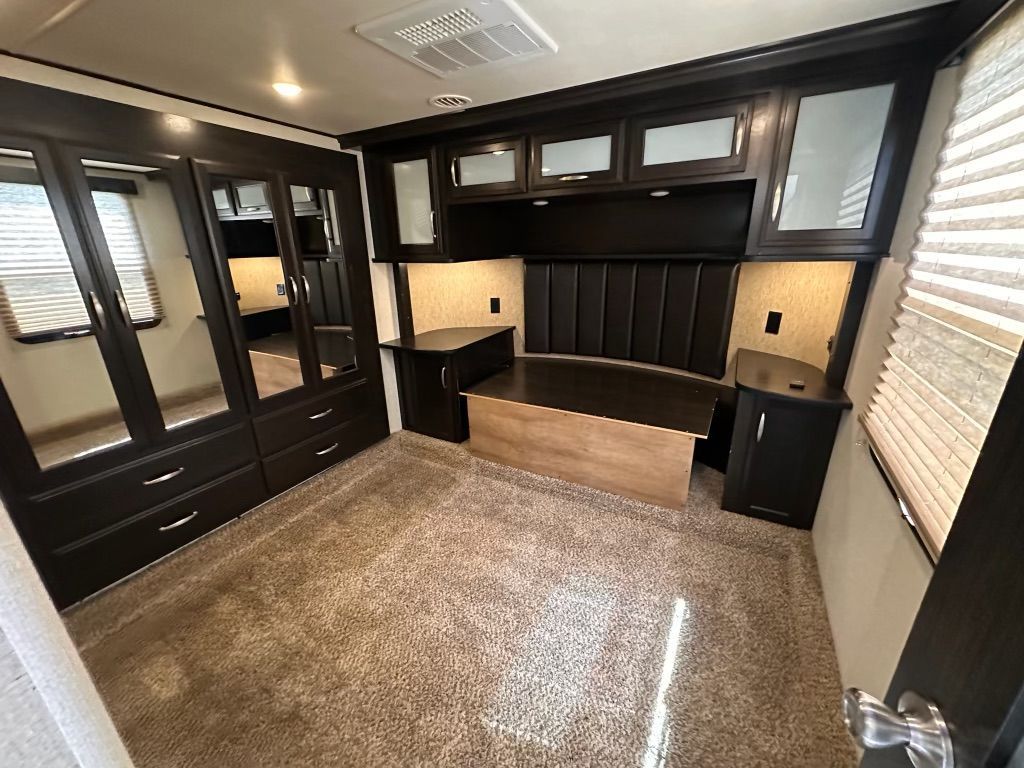 This 40-foot Cameo fifth wheel offers a spacious, open living area with four slide-outs that create an incredibly roomy interior. The king master bedroom features a fireplace and a smart TV, making it a perfect retreat for relaxation. The master bath is large and luxurious, providing comfort and privacy. The expansive living and kitchen areas are perfect for gatherings, with plenty of space to entertain or unwind. This fifth wheel offers the perfect combination of luxury and functionality, ideal for use as a green room or mobile retreat.