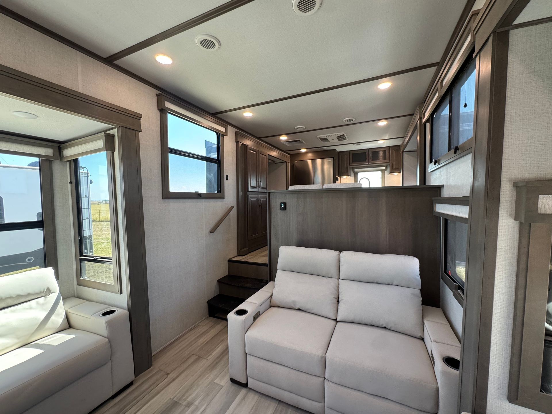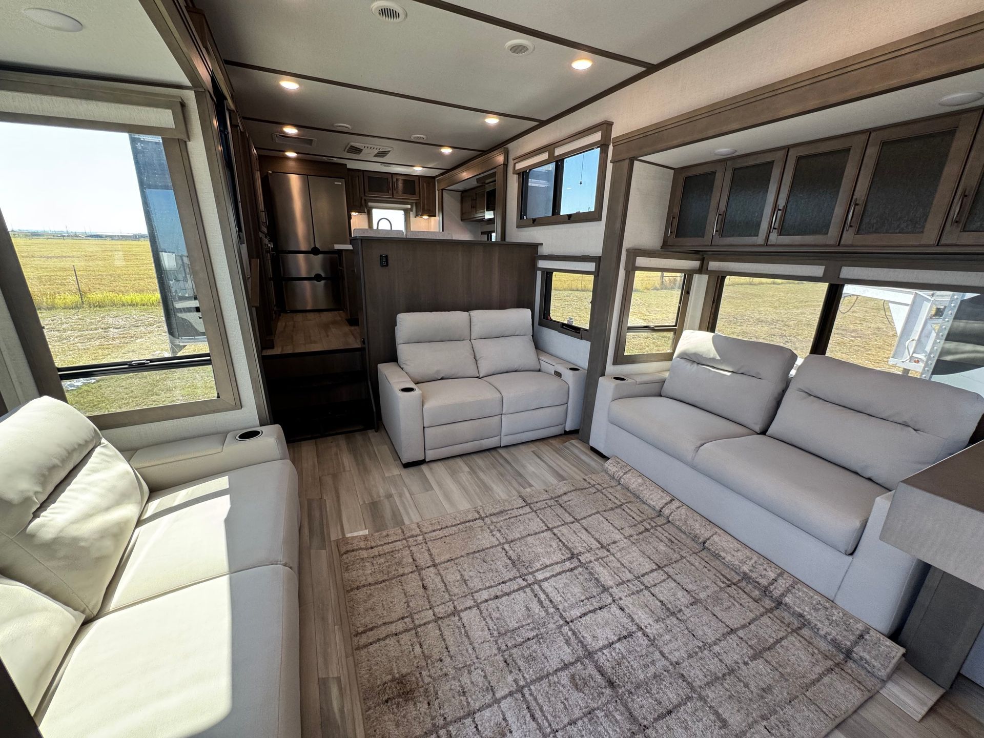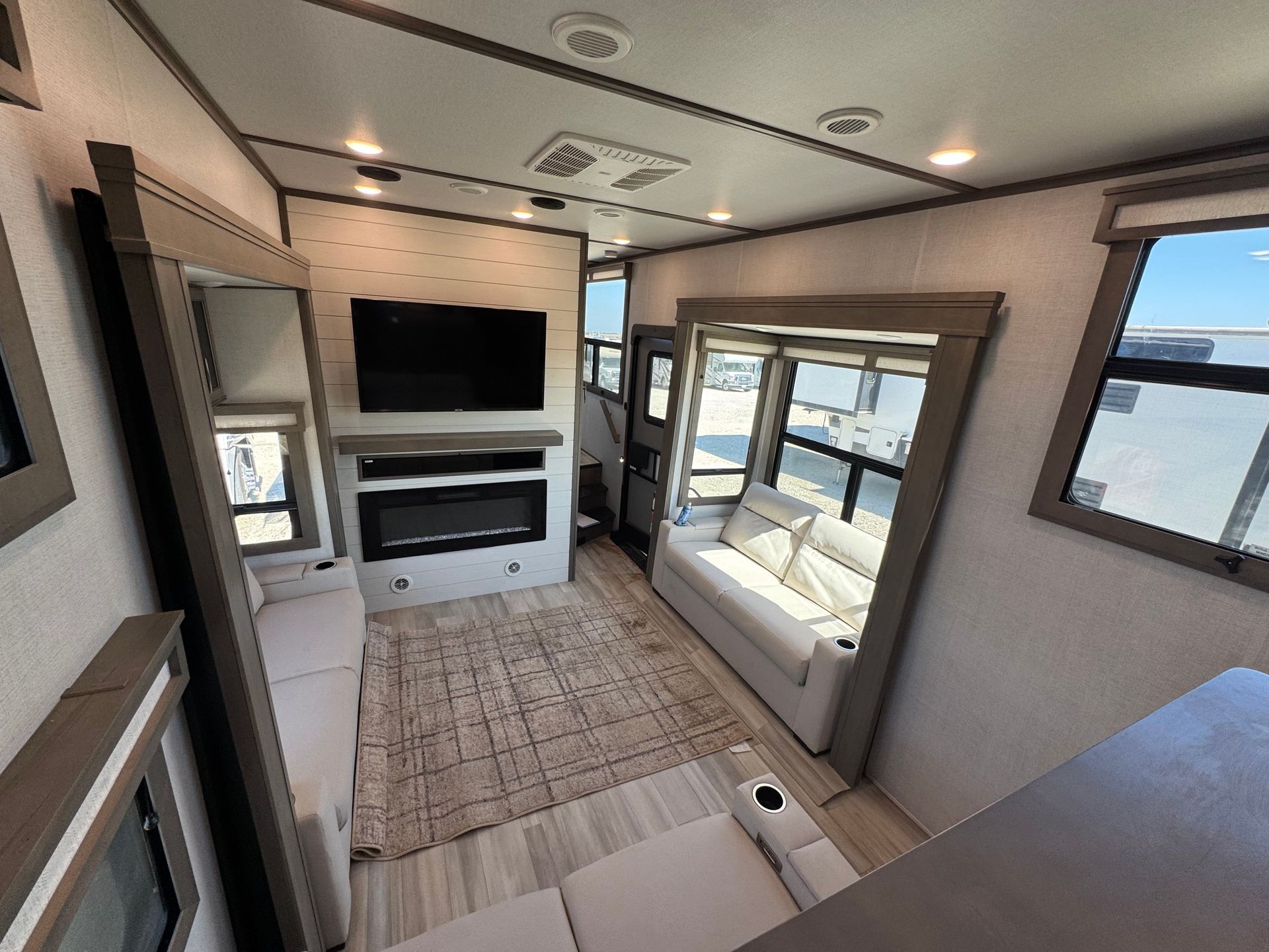 This luxurious Columbus open living fifth wheel is designed for comfort and functionality, offering a private rear king bedroom with a large full bathroom for ultimate relaxation. The living room features a TV and fireplace, creating a cozy space to unwind. With two pullout sleeper sofas and two recliners, there’s plenty of seating for everyone. The kitchen rivals any home with a residential fridge, abundant cabinet space, and ample counter space for meal prep. Plus, a washer and dryer are included, making this fifth wheel perfect for full-time living or extended stays.