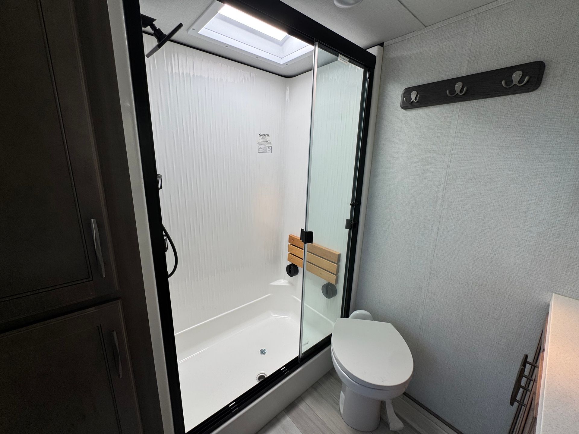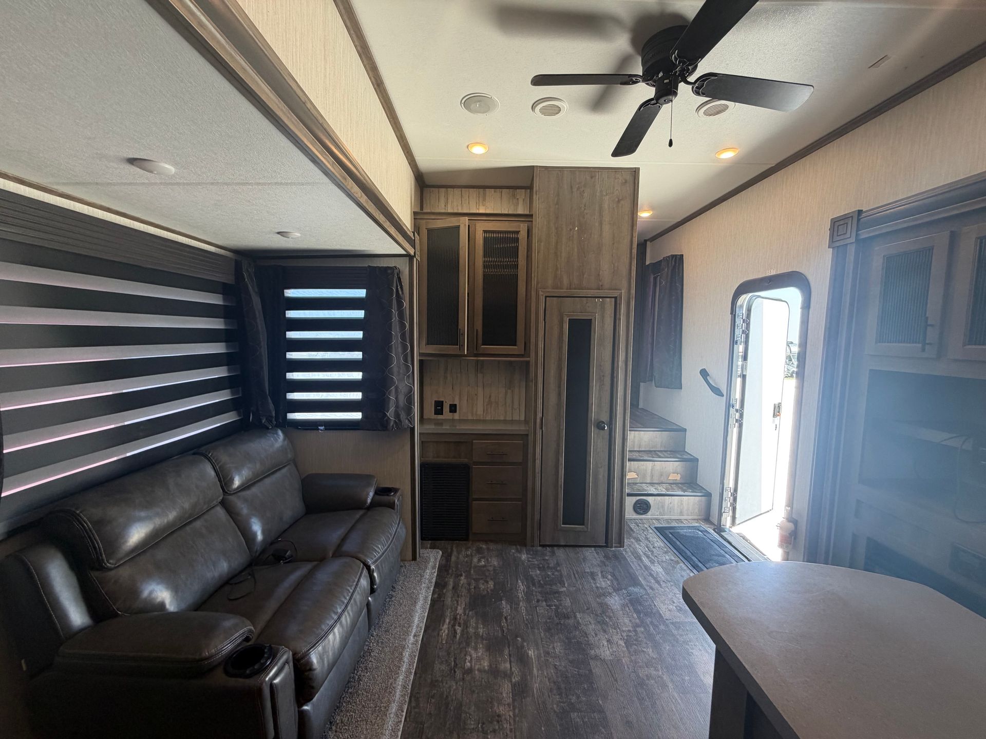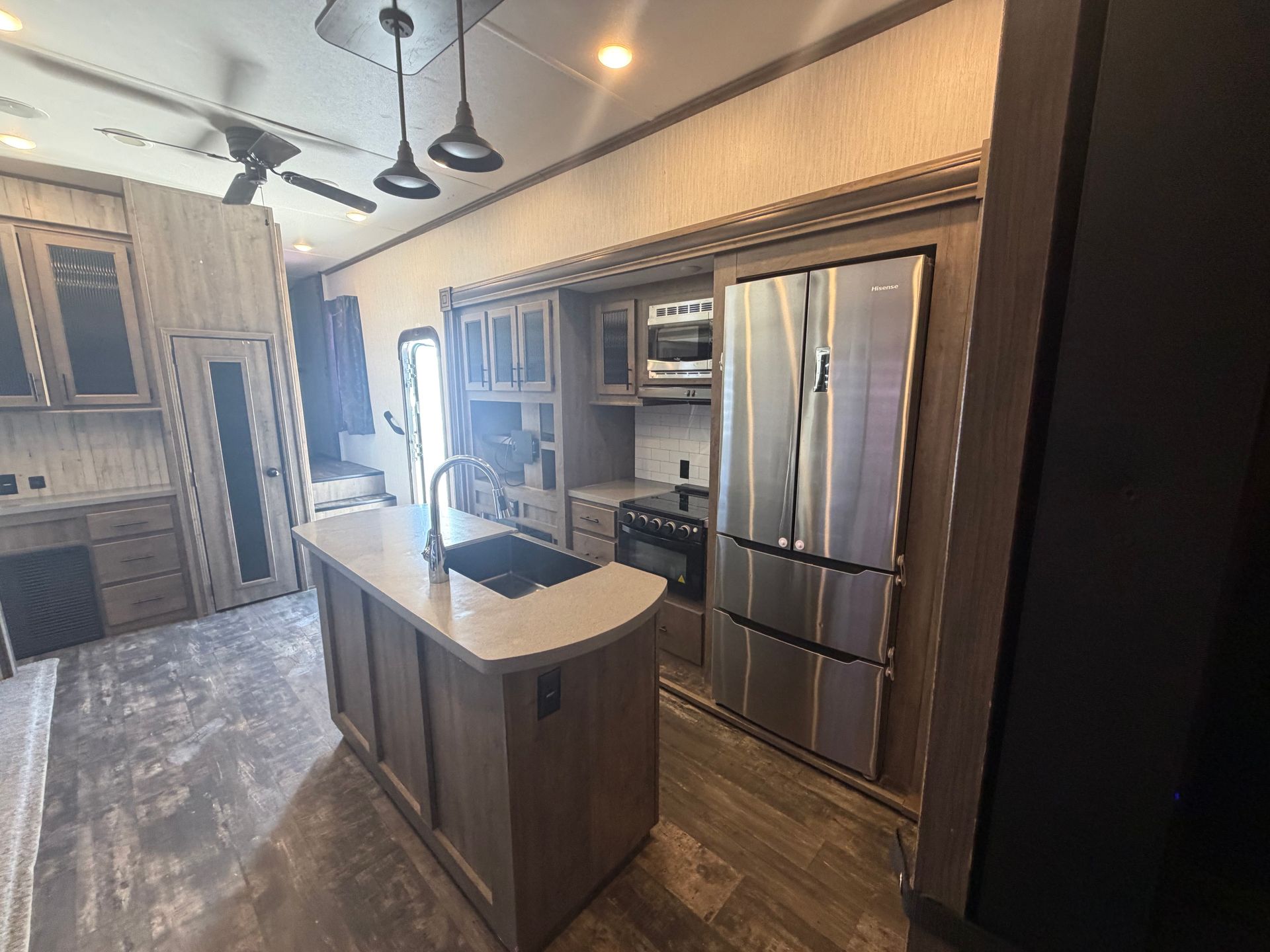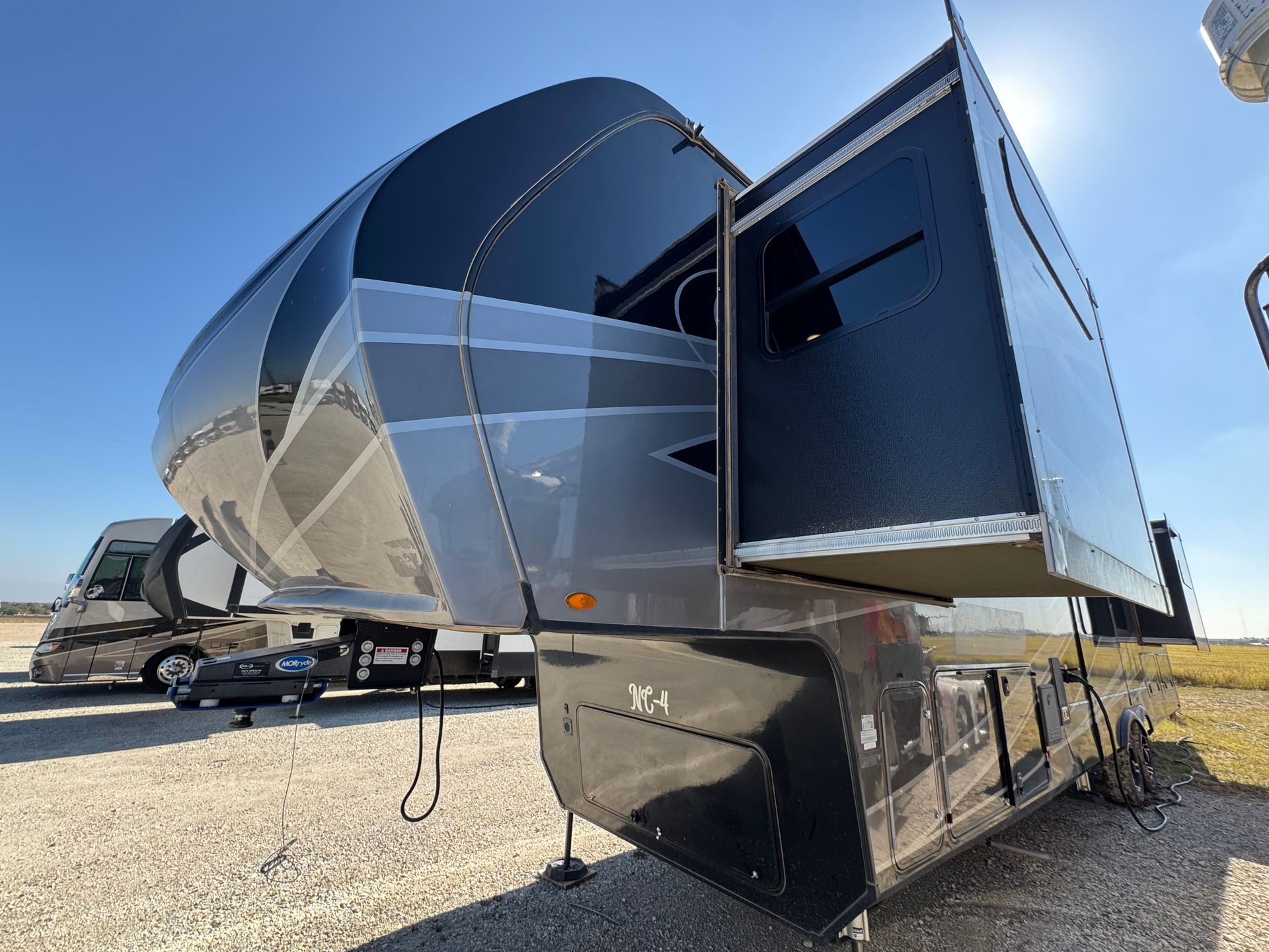 This luxurious Columbus open living fifth wheel is designed for comfort and functionality, offering a private rear king bedroom with a large full bathroom for ultimate relaxation. The living room features a TV and fireplace, creating a cozy space to unwind. With two pullout sleeper sofas and two recliners, there’s plenty of seating for everyone. The kitchen rivals any home with a residential fridge, abundant cabinet space, and ample counter space for meal prep. Plus, a washer and dryer are included, making this fifth wheel perfect for full-time living or extended stays.