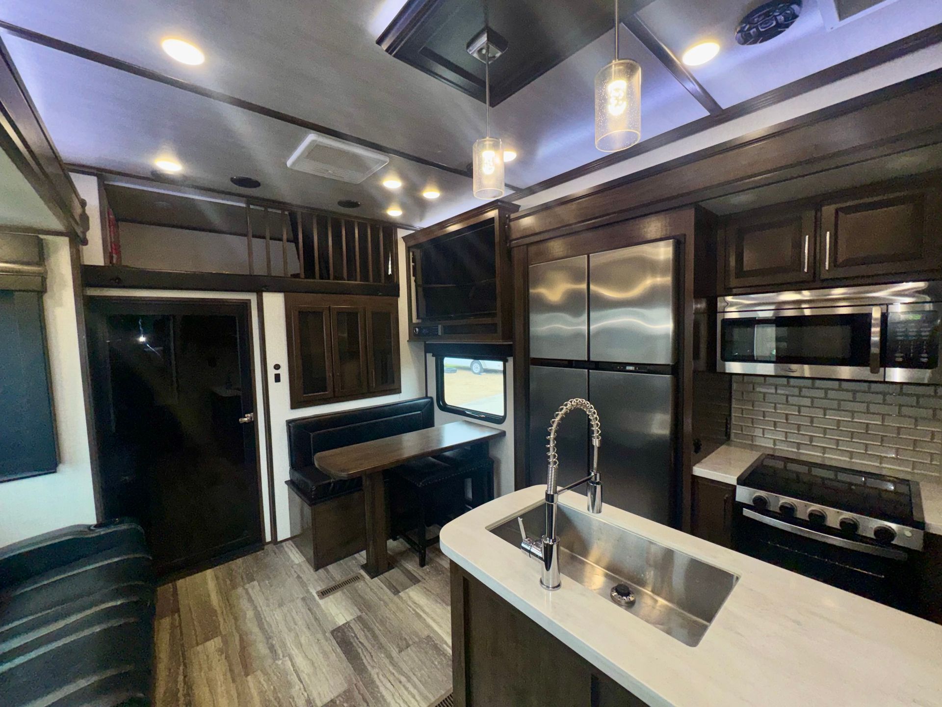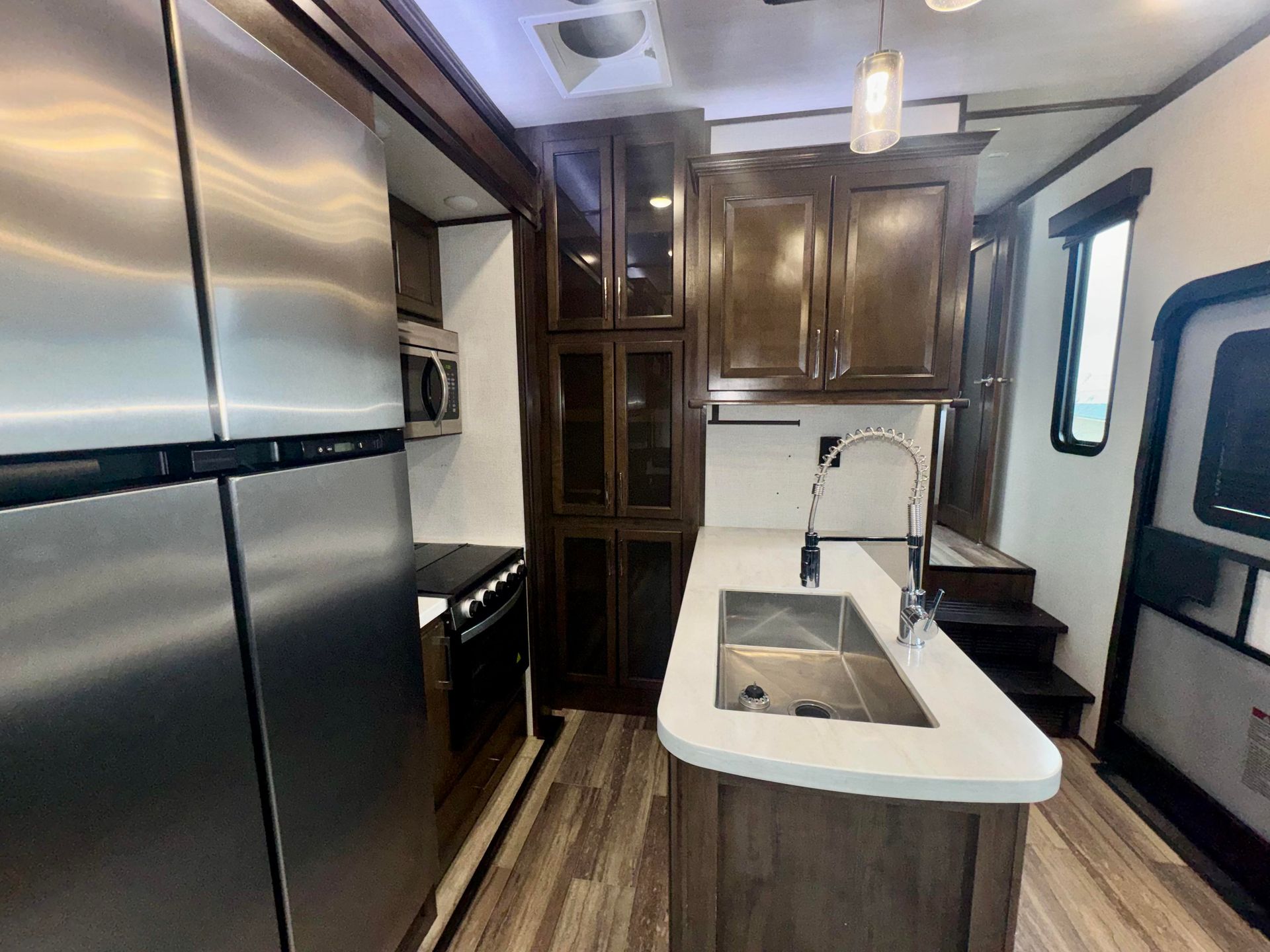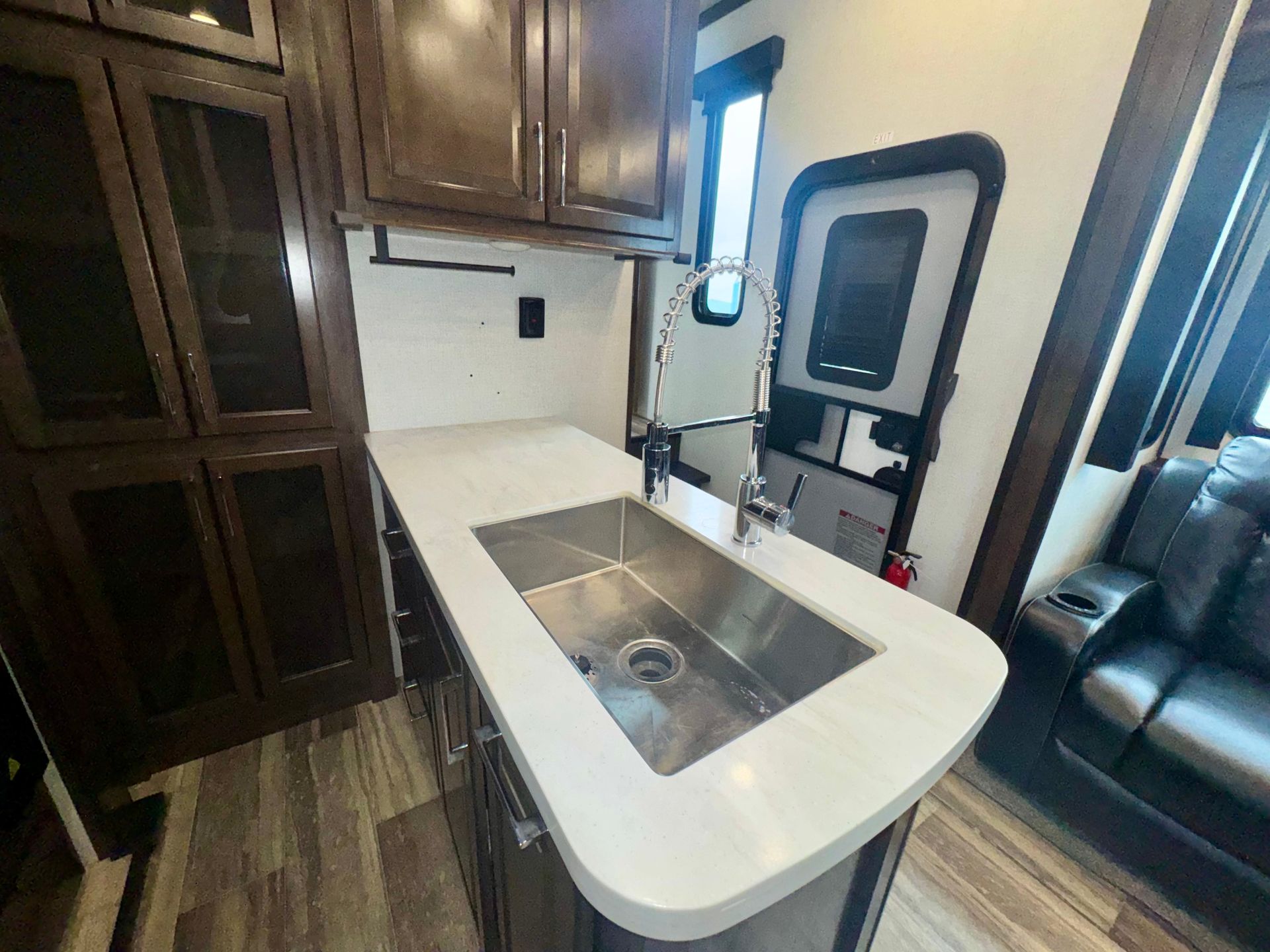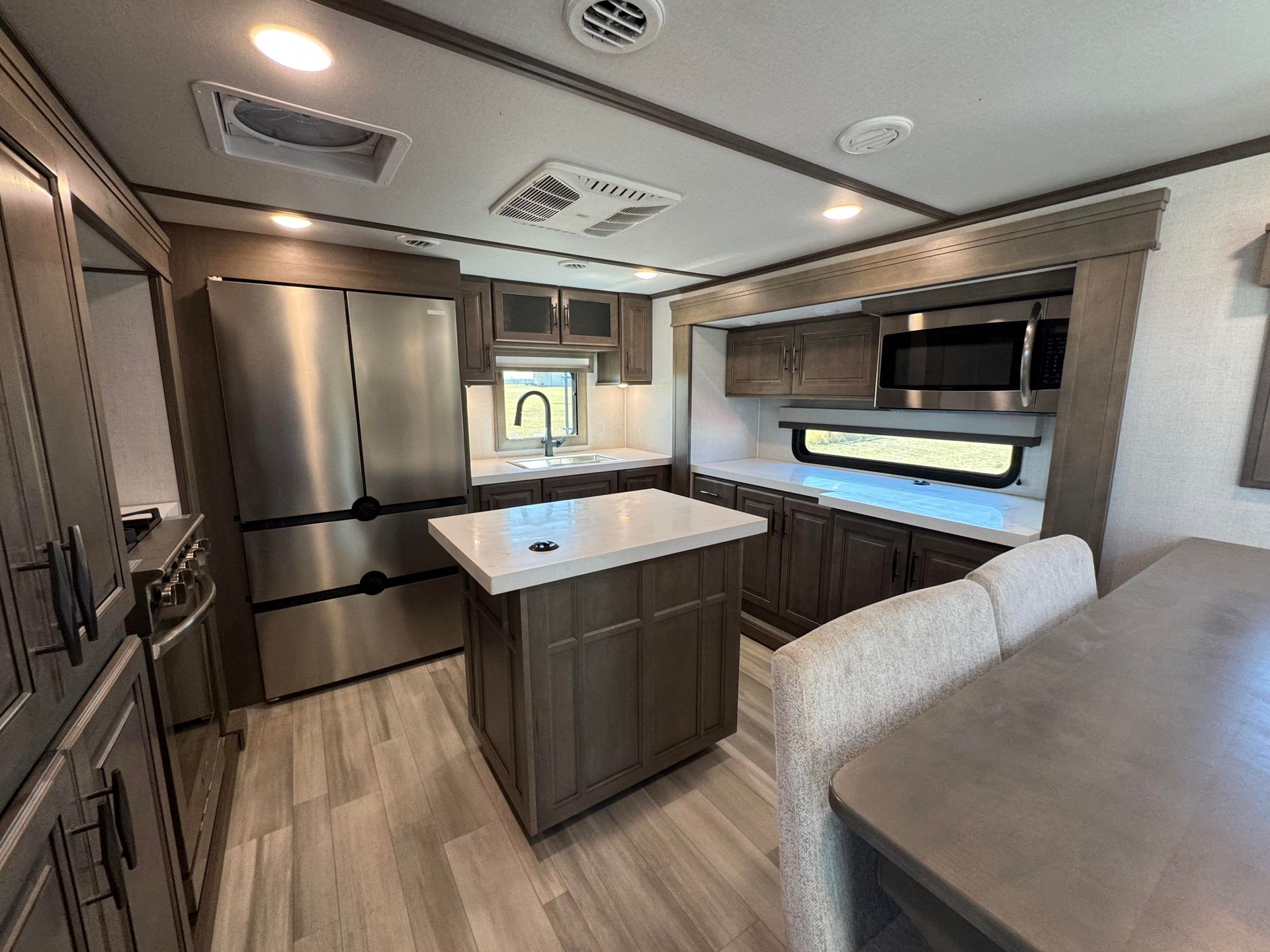 The 2023 Solitude 390RK is a luxury fifth-wheel perfect for renters who want a spacious, residential-style experience on the road. Its unique rear kitchen layout offers a full-size cooking space with plenty of counter room, making it great for longer stays or travelers who enjoy cooking. The living area includes cozy theatre seating and a large entertainment setup, giving you a true home-away-from-home feel. With high-end finishes, generous storage, and a comfortable bedroom and bathroom, this RV provides both comfort and convenience for couples or small families. It’s an ideal choice if you’re looking for a premium, comfortable, and roomy RV getaway.