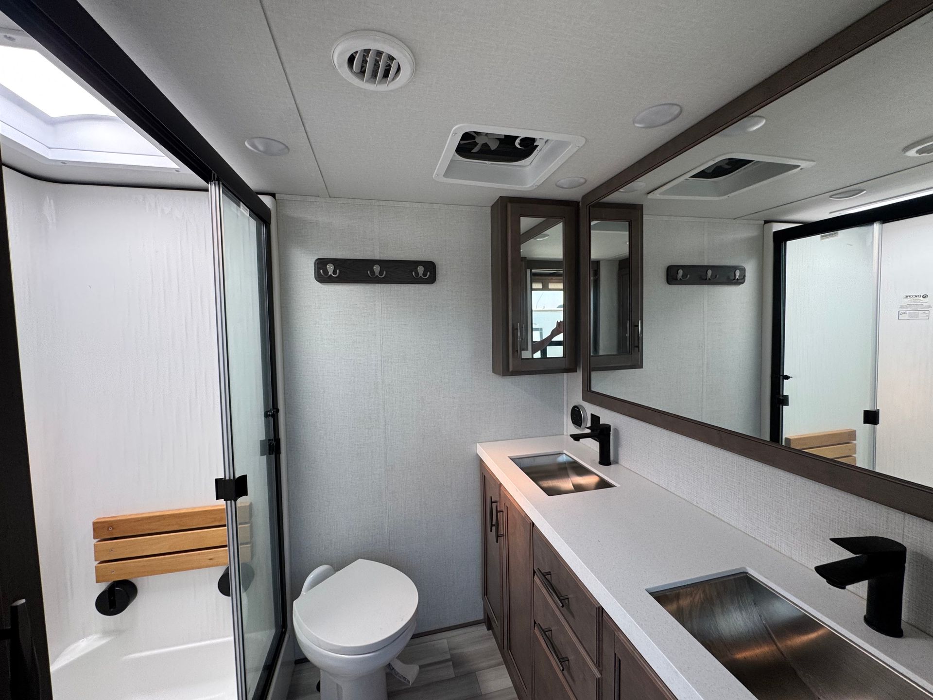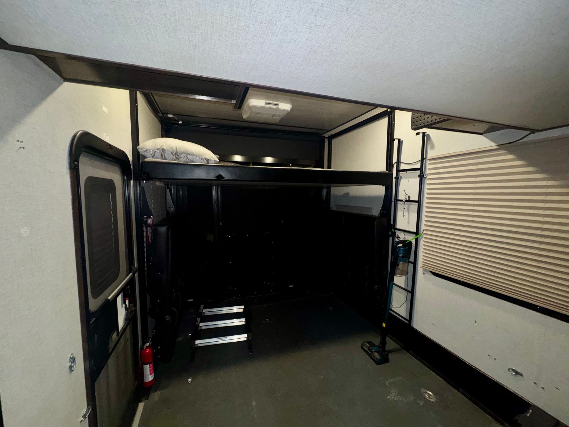 2023 Ahara 378BH is a true family-friendly luxury fifth wheel, designed to combine comfort, space, and style for unforgettable adventures. This bunkhouse model offers a versatile layout with a private front master suite, a spacious mid-living area, and a rear bunkhouse with its own half bath-ideal for kids or guests. Inside, the gourmet kitchen features residential appliances, a large refrigerator, solid-surface countertops, a pantry, and plenty of storage to make cooking on the road a breeze. The living room offers plush seating, a fireplace, and an entertainment center, creating the perfect space to relax after a day outdoors. The spacious master suite includes a king bed, generous wardrobe space, and direct access to the full bathroom with a large shower and modern finishes. The rear bunkhouse provides multiple sleeping options, storage, and its own half bath for extra convenience, making it perfect for families or groups. With sleeping capacity for up to 8-10 people, everyone can enjoy a comfortable stay.