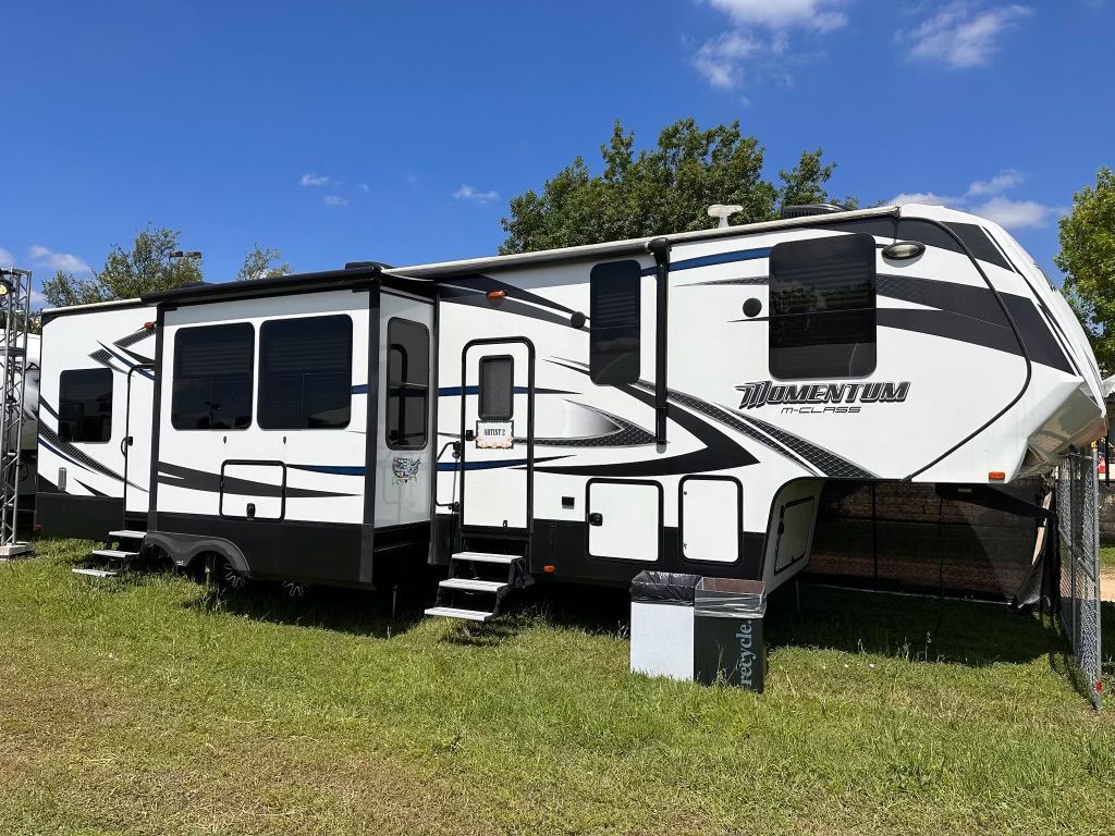 2015 Grand Design Momentum 350 is a premium toy hauler designed for adventurers who want to combine hauling capability with residential comfort. Featuring a spacious rear garage, it's perfect for transporting ATV's, motorcycles, or other outdoor gear, and it easily converts into additional living and sleeping space with sofas, a drop-down bed, and its own half bath. The main living area offers a wide-open layout with large slide-outs, plush seating, a full entertainment center, and a cozy fireplace for relaxing after a day of adventure. The gourmet kitchen features solid- surface countertops, a residential refrigerator, stainless steel appliances, and ample storage for all your cooking essentials. The private master suite includes a king bed, wardrobe storage, and direct access to the full bathroom with a large shower and modern fixtures. With multiple sleeping areas, the Momentum 350 comfortably accommodates up to 8 people, making it ideal for families or groups of adventurers.
