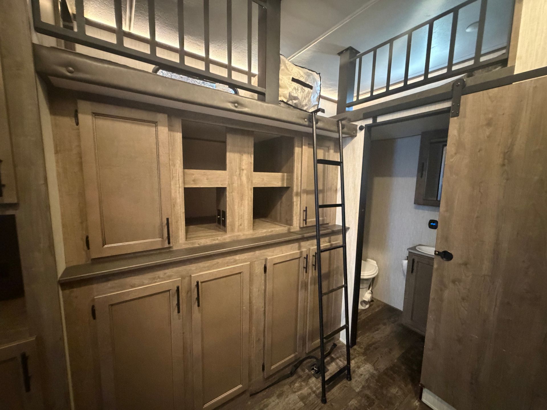 2023 Ahara 378BH is a true family-friendly luxury fifth wheel, designed to combine comfort, space, and style for unforgettable adventures. This bunkhouse model offers a versatile layout with a private front master suite, a spacious mid-living area, and a rear bunkhouse with its own half bath-ideal for kids or guests. Inside, the kitchen features residential appliances, a large refrigerator, solid-surface countertops, a pantry, and plenty of storage. The living room offers plush seating, a fireplace, and an entertainment center, creating the perfect space to relax after a day outdoors. The spacious master suite includes a king bed, generous wardrobe space, and direct access to the full bathroom with a large shower and modern finishes. The rear bunkhouse provides multiple sleeping options, storage, and its own half bath for extra convenience, making it perfect for families or groups. With sleeping capacity for up to 8-10 people, everyone can enjoy a comfortable stay.
