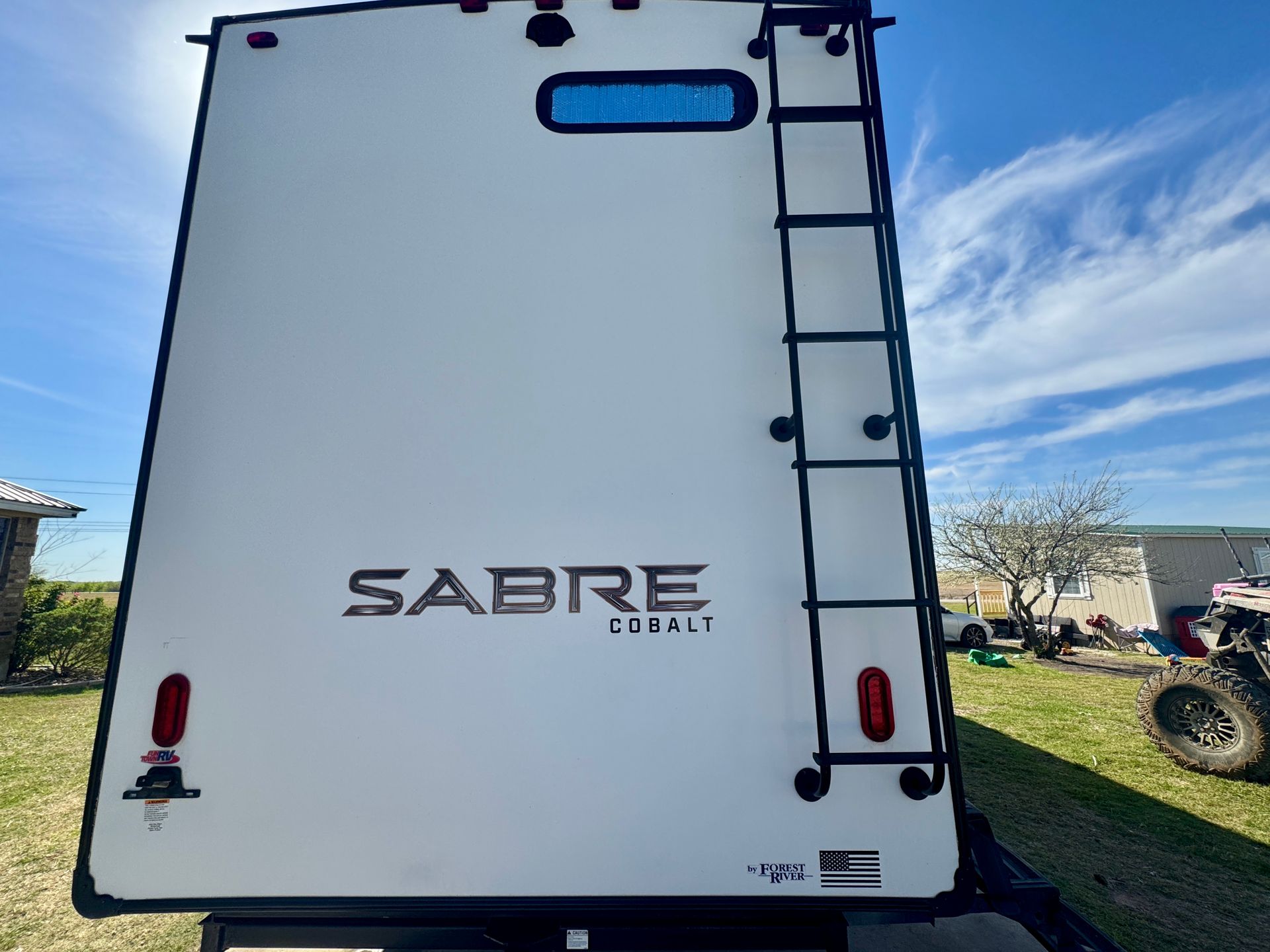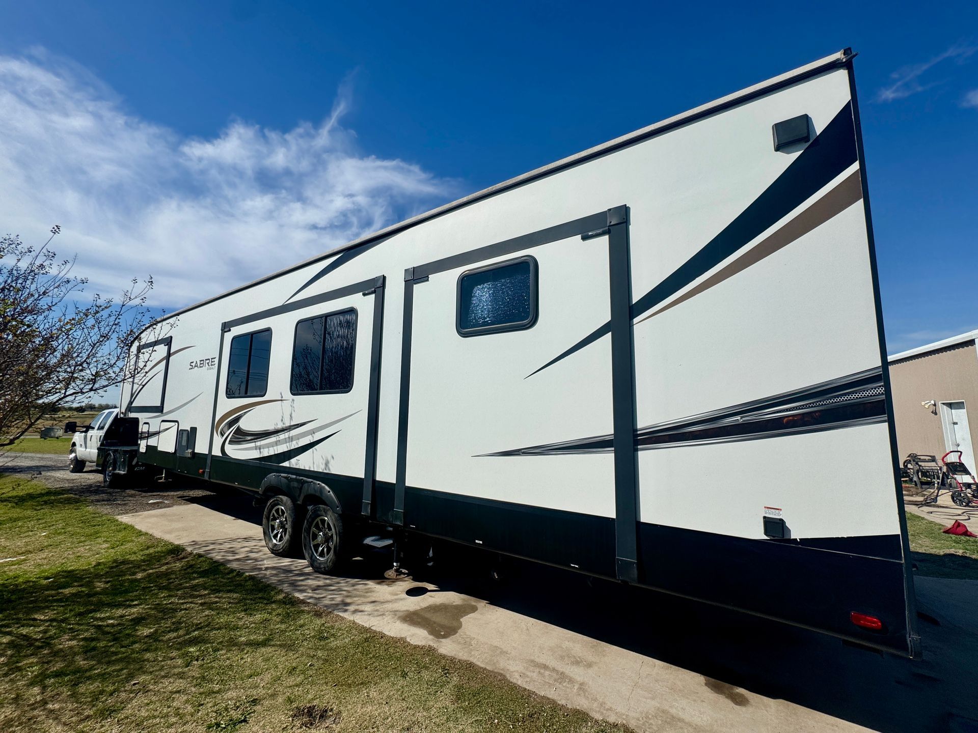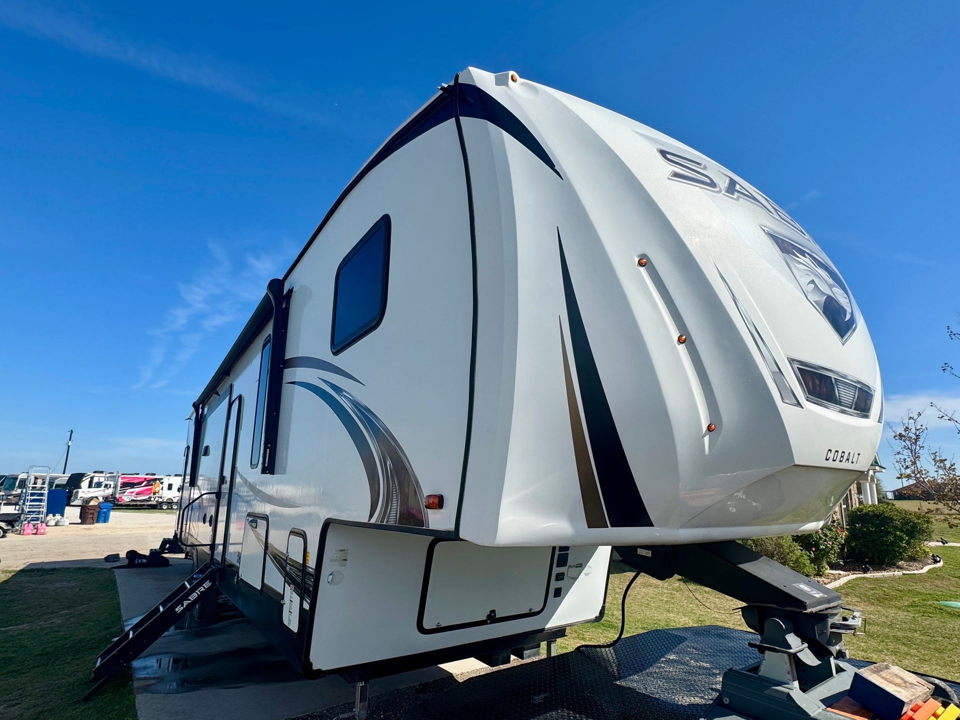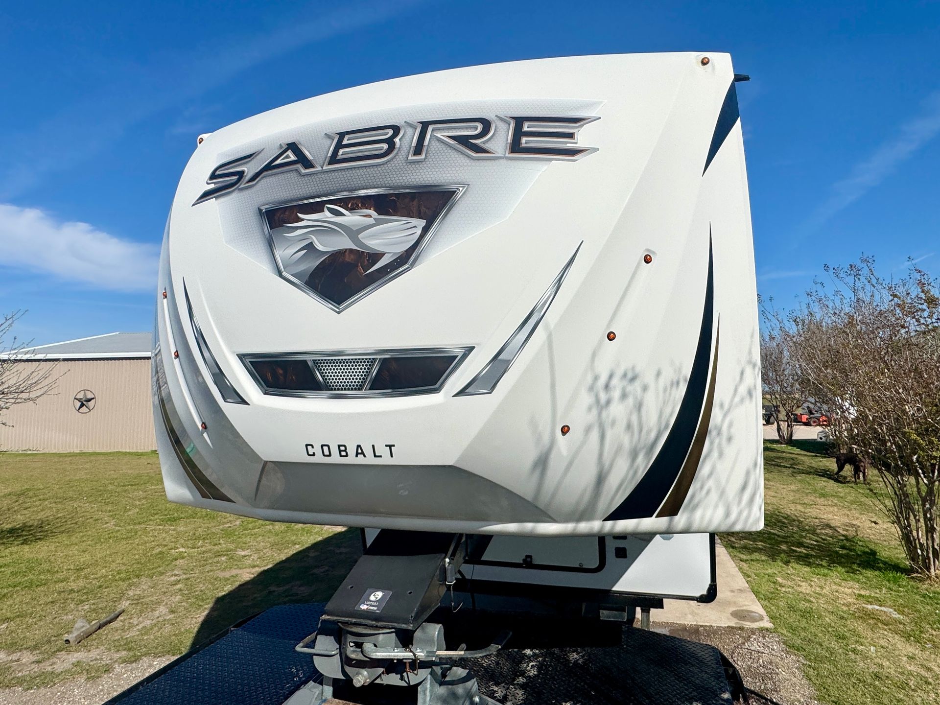 The 2021 Sabre 38DBQ fifth wheel comes with a residential fridge, a kitchen island with sink, gas stove & oven. The master room has a queen bed and full bath. The bunk room with 3 twins and a full size pull out couch also features a second full bath. 50 amp, 3 grey tanks, 2 black tanks with a self clean system.