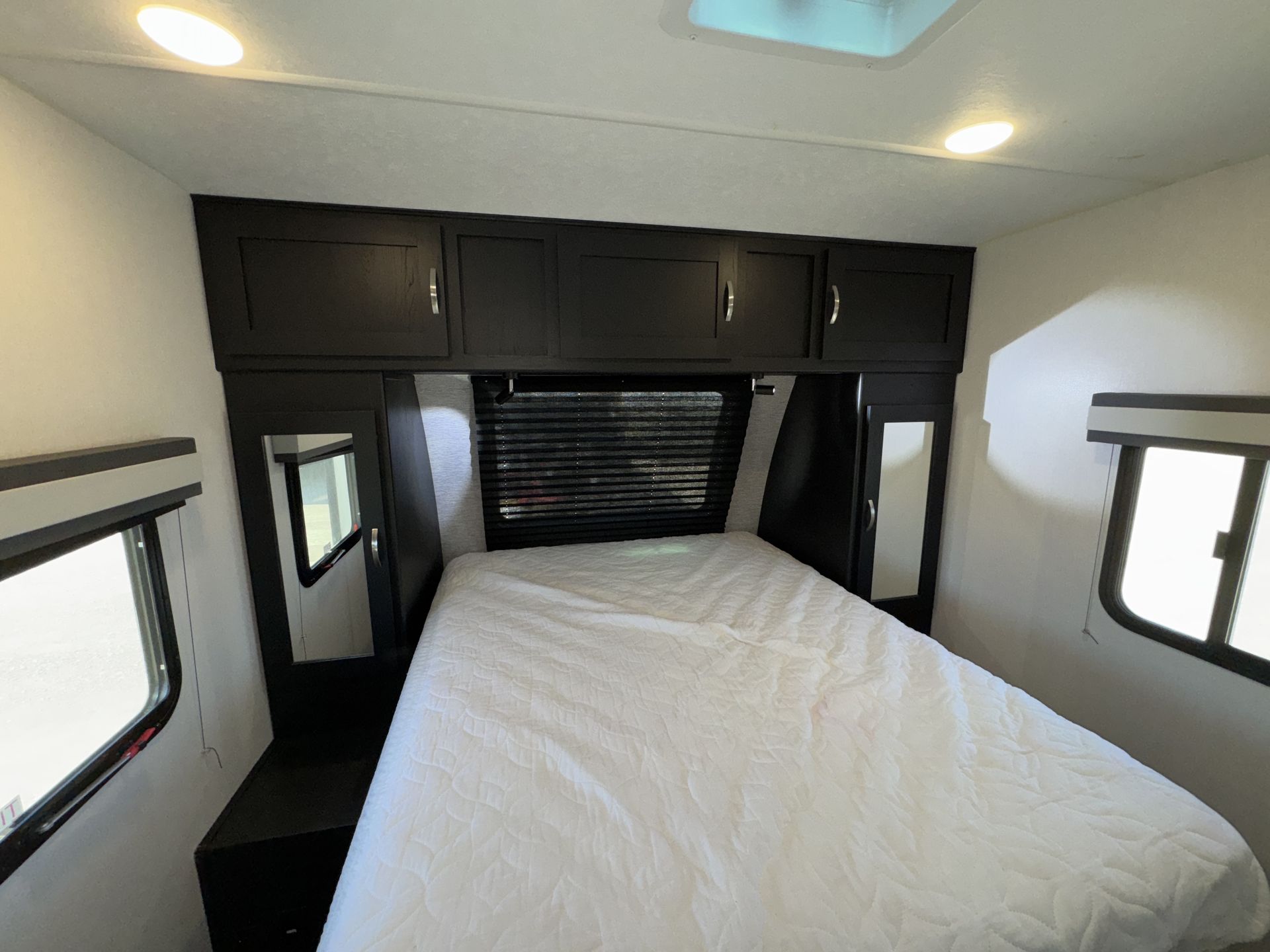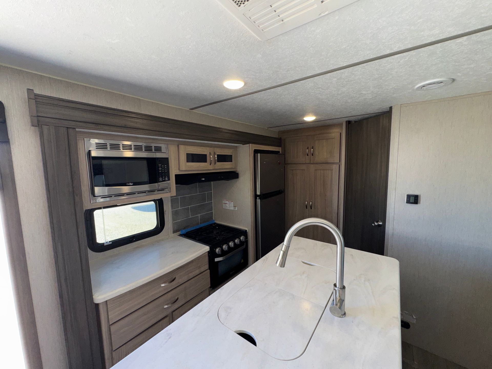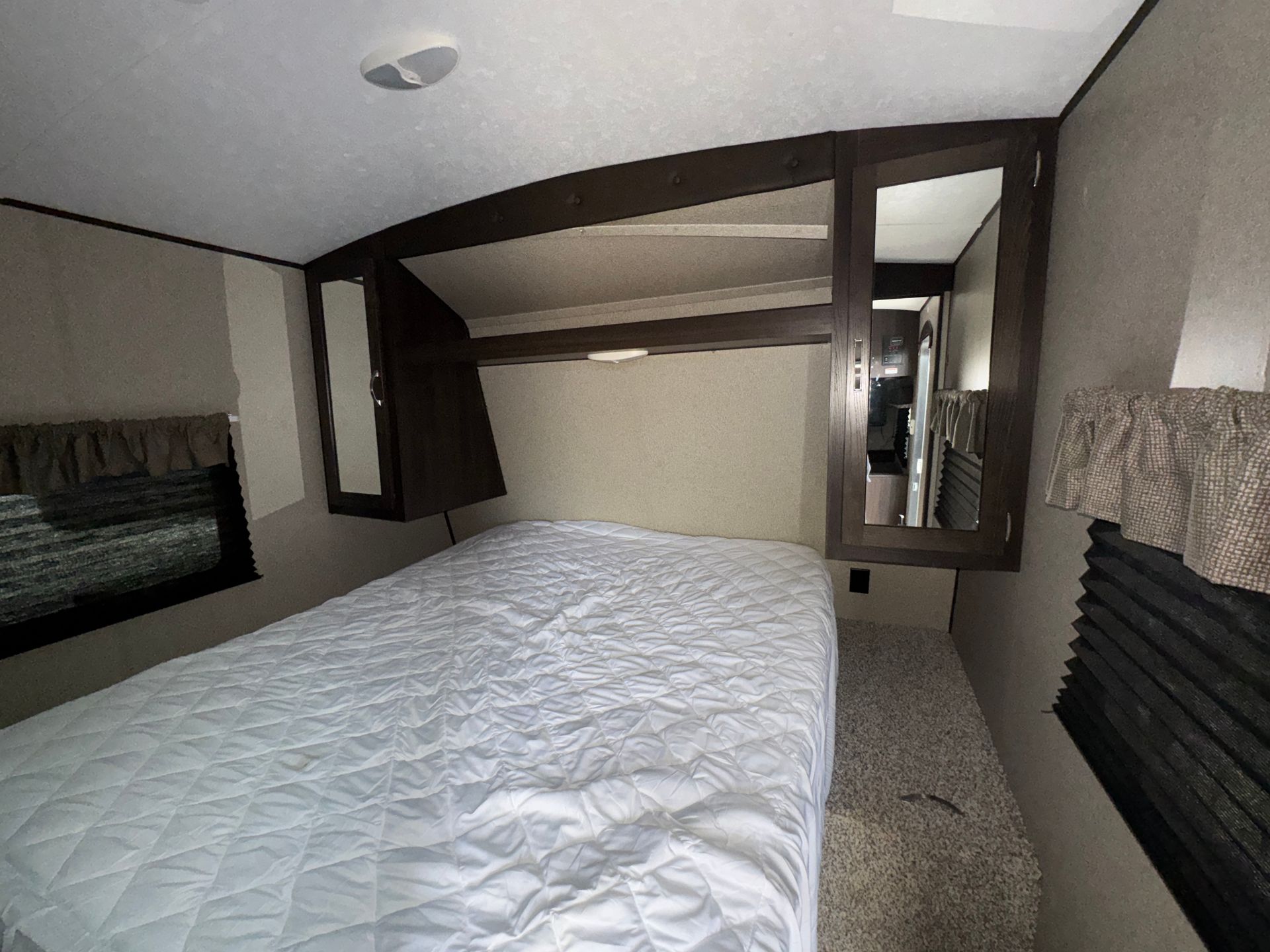 This model is a well-configured family travel trailer designed for comfort and versatility. It features a single slide-out, dual entry doors, and two distinct bedroom areas. At the front, you'll find a private master bedroom with a queen bed, nightstands and shirt closets. At the rear there's another queen bed arrangement. The main living/kitchen area sits in between, with a sofa, U-shaped dinette (which also converts to a bed) and full kitchen amenities. 3-burner cooktop, 11 cu ft refrigerator, walk-in pantry.