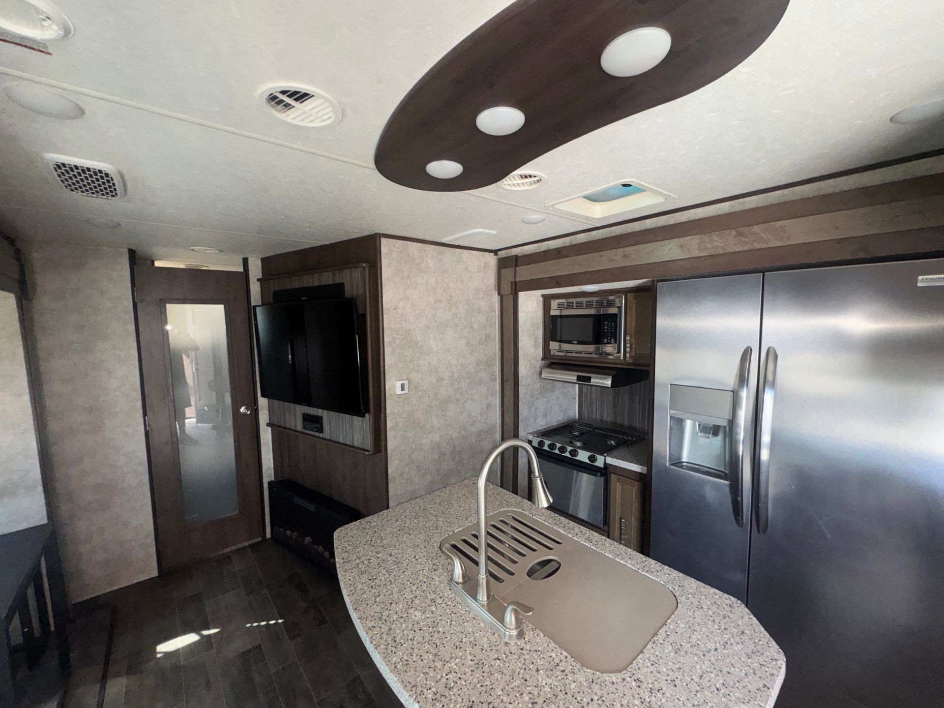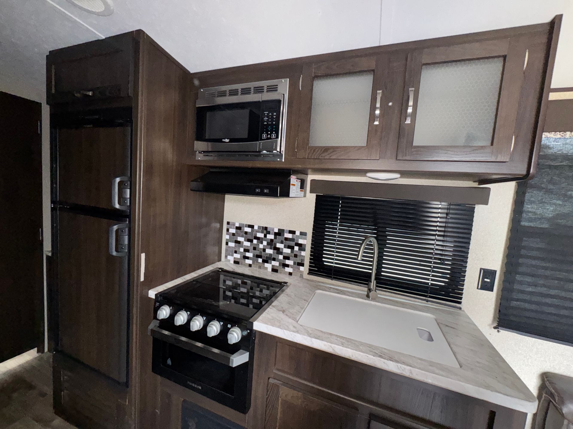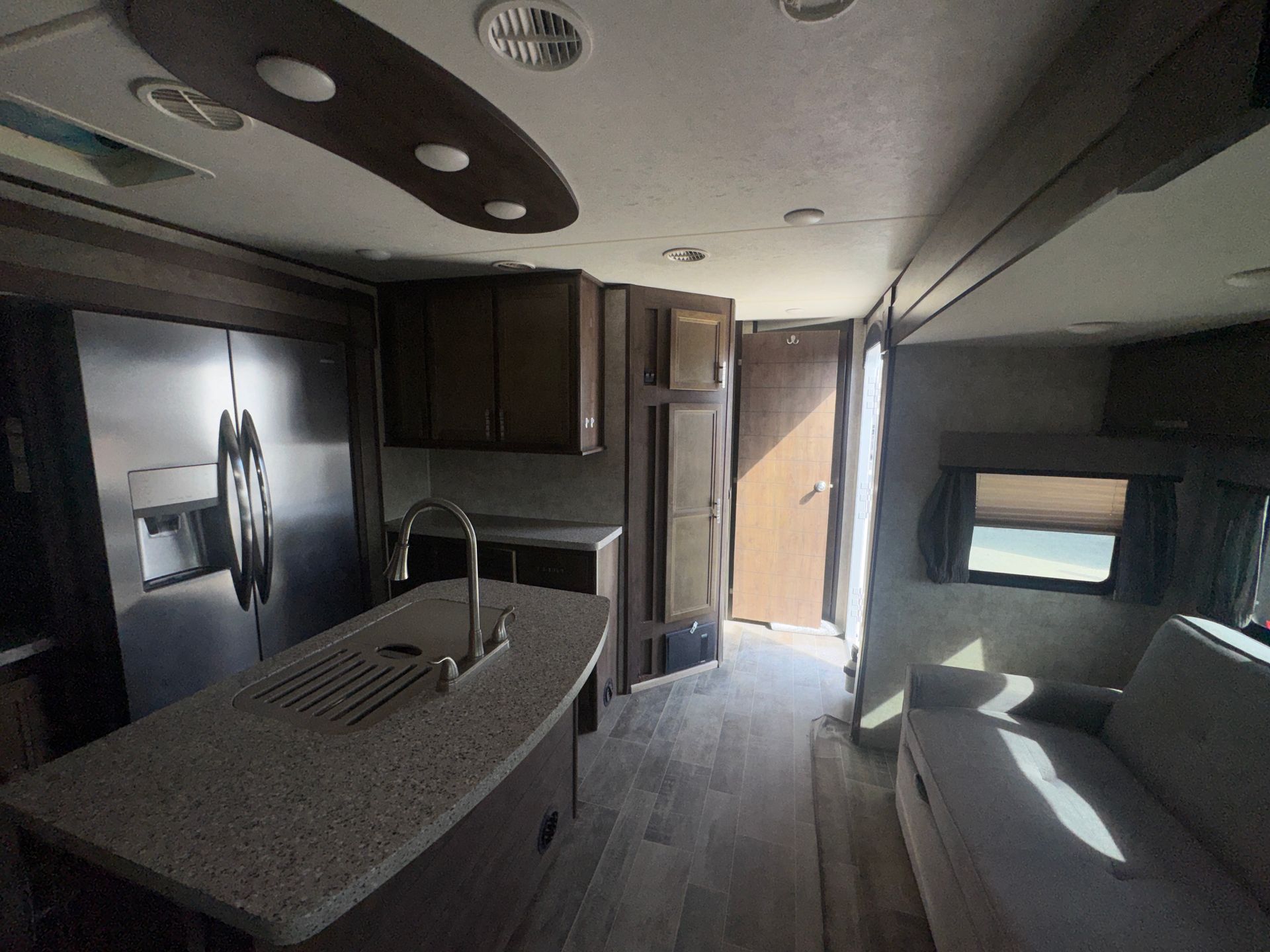 This model is a well-configured family travel trailer designed for comfort and versatility. It features a single slide-out, dual entry doors, and two distinct bedroom areas. At the front, you'll find a private master bedroom with a queen bed, nightstands and shirt closets. At the rear there's another queen bed arrangement. The main living/kitchen area sits in between, with a sofa, U-shaped dinette (which also converts to a bed) and full kitchen amenities. 3-burner cooktop, 11 cu ft refrigerator, walk-in pantry.