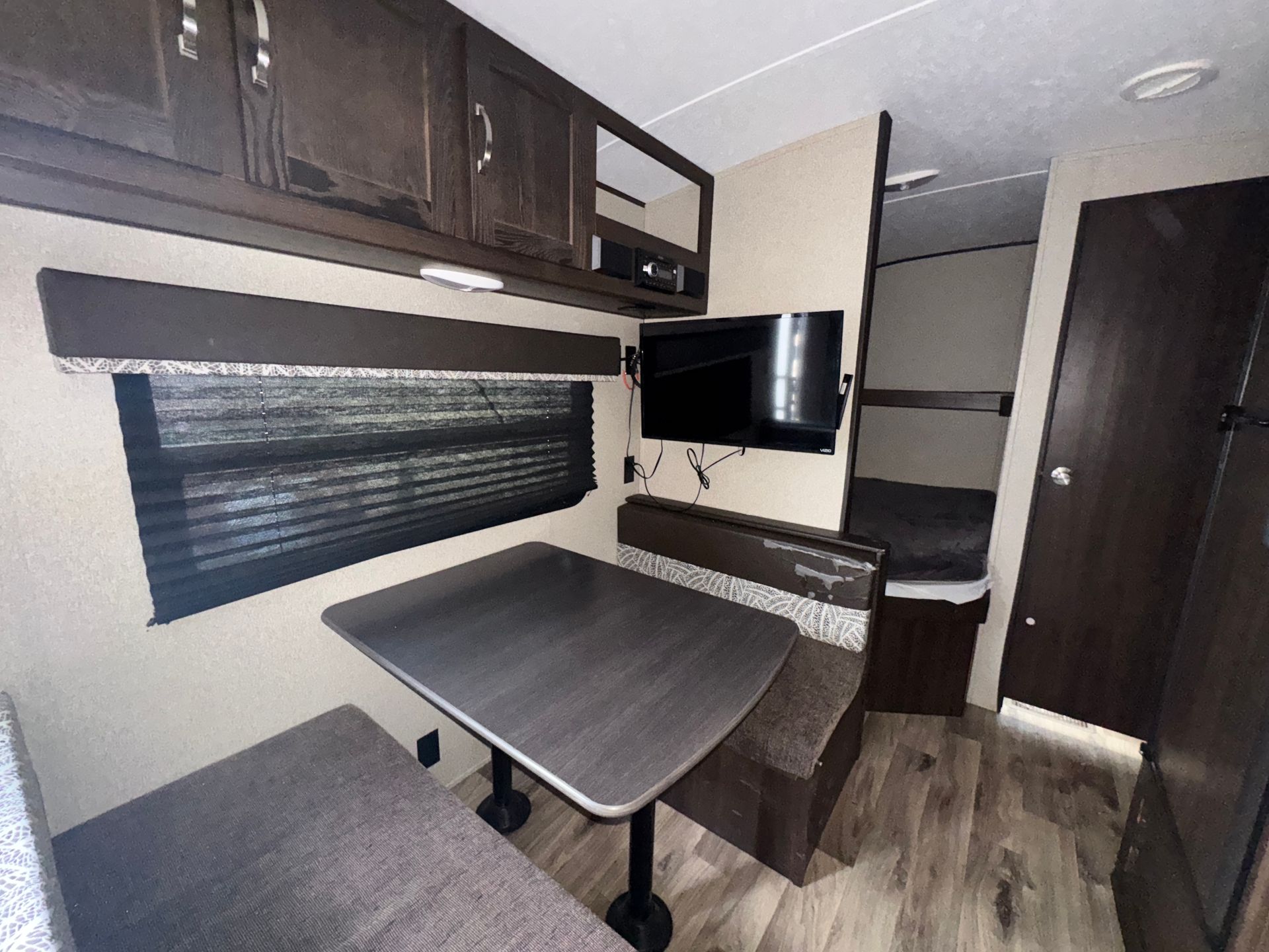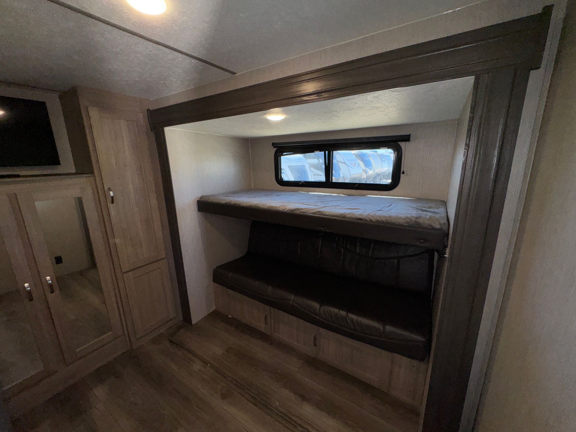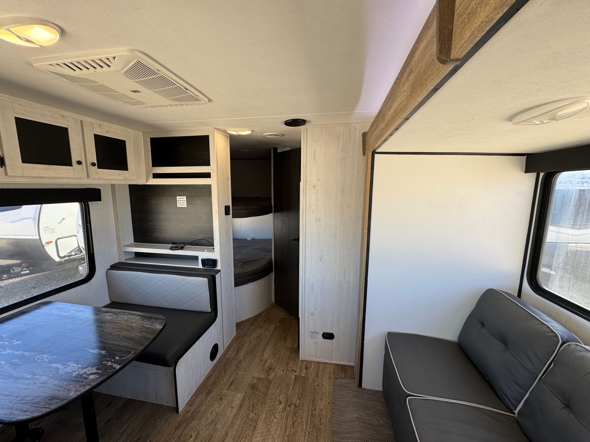 This 29-foot Passport travel trailer offers a great balance of size and style . Featuring one slide for extra space, it includes a cozy queen bedroom and two full bunks a kitchen dinette conversion and pullout couch, perfect for families or guests. The full interior kitchen, exterior kitchen and bathroom provide everything you need for a comfortable stay, whether you're on a weekend getaway or a longer trip. Compact yet well-equipped, this trailer is ready for your next adventure.