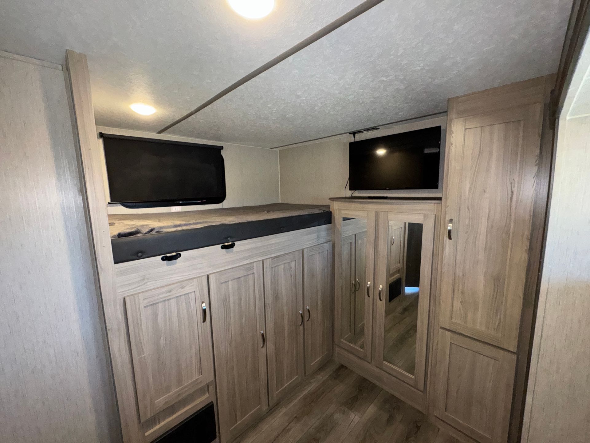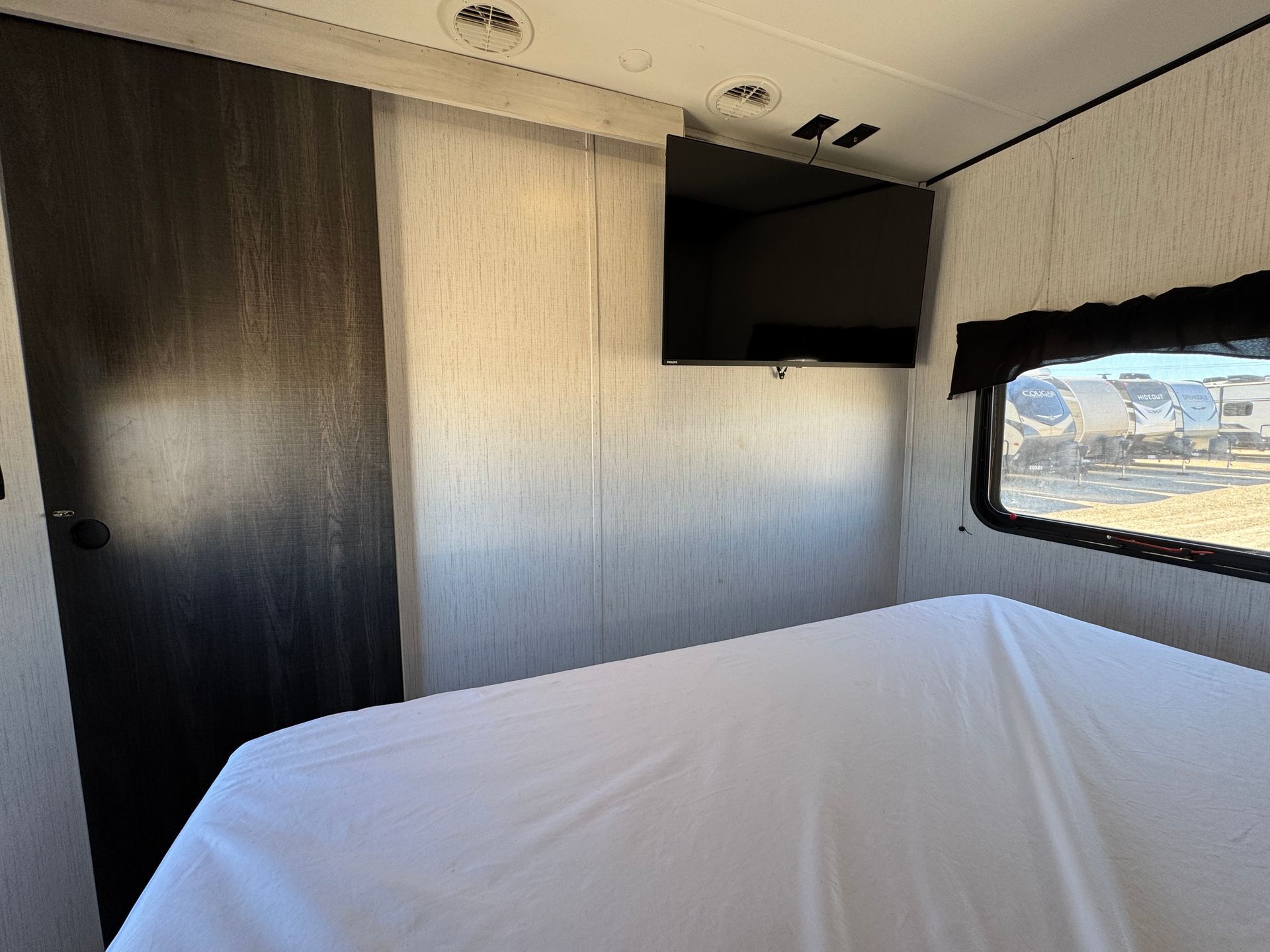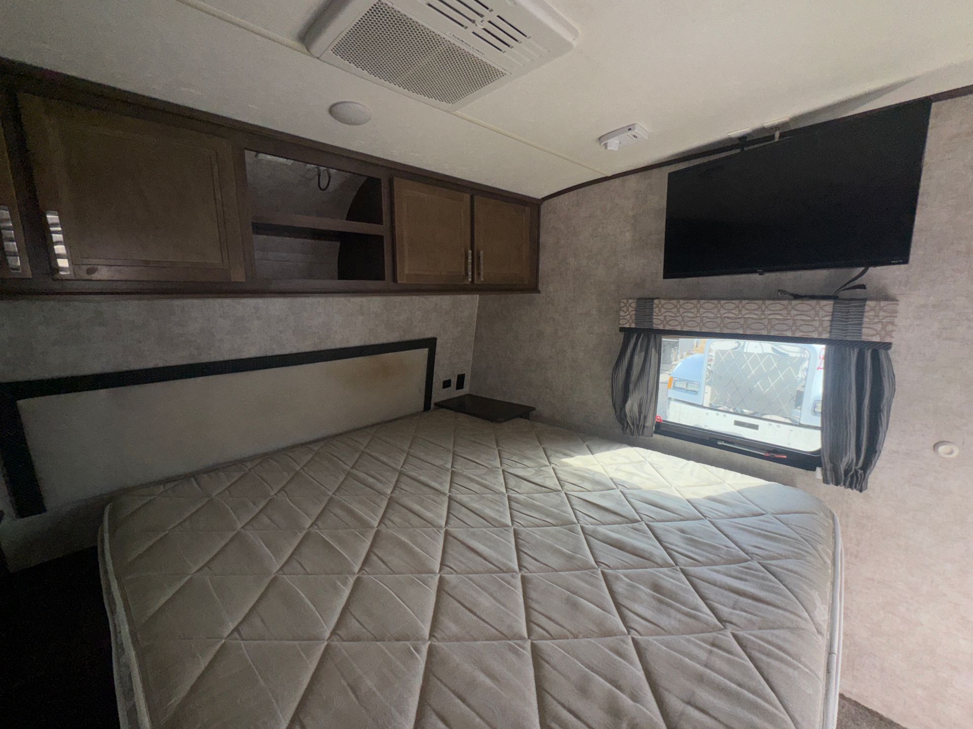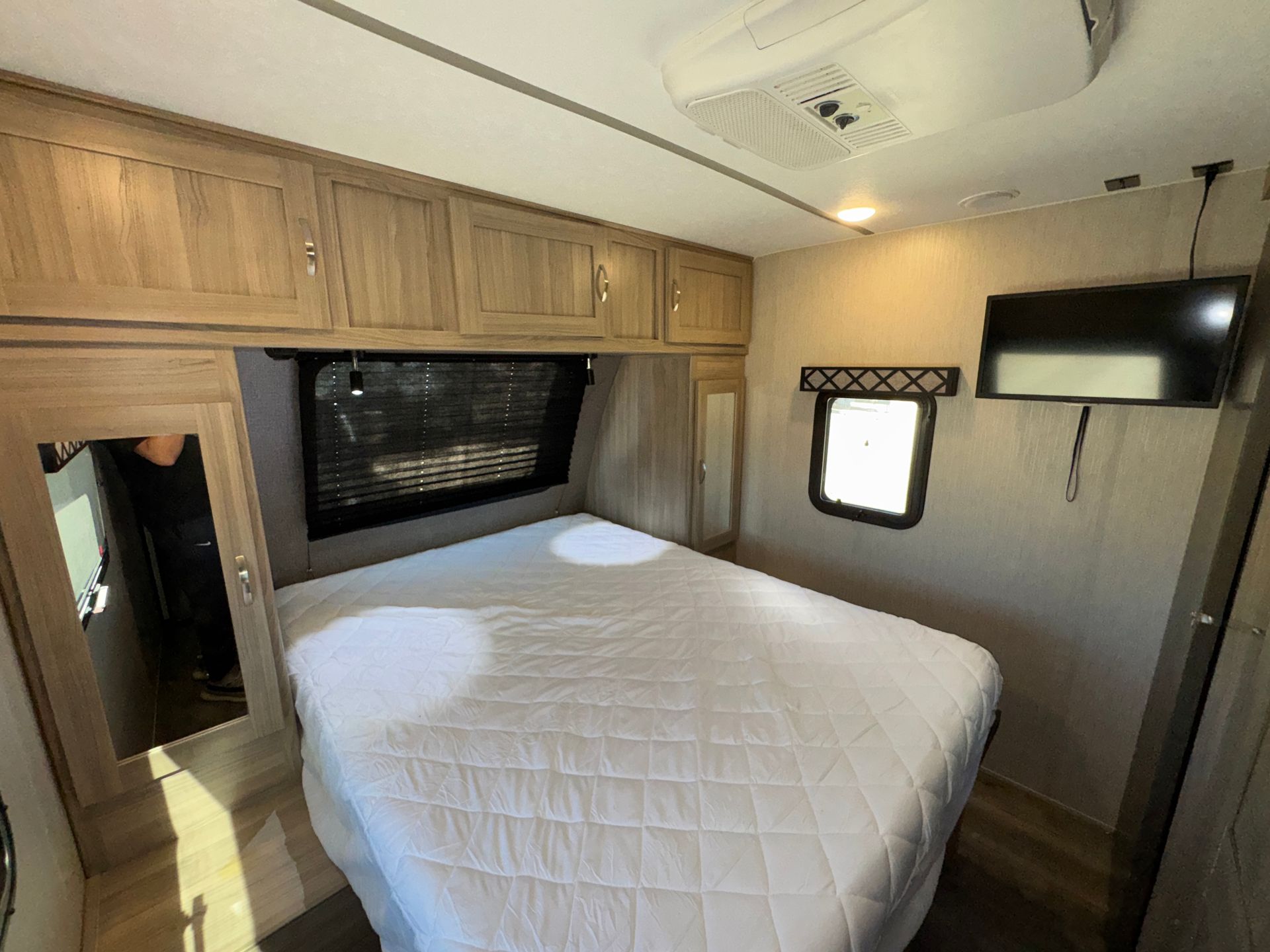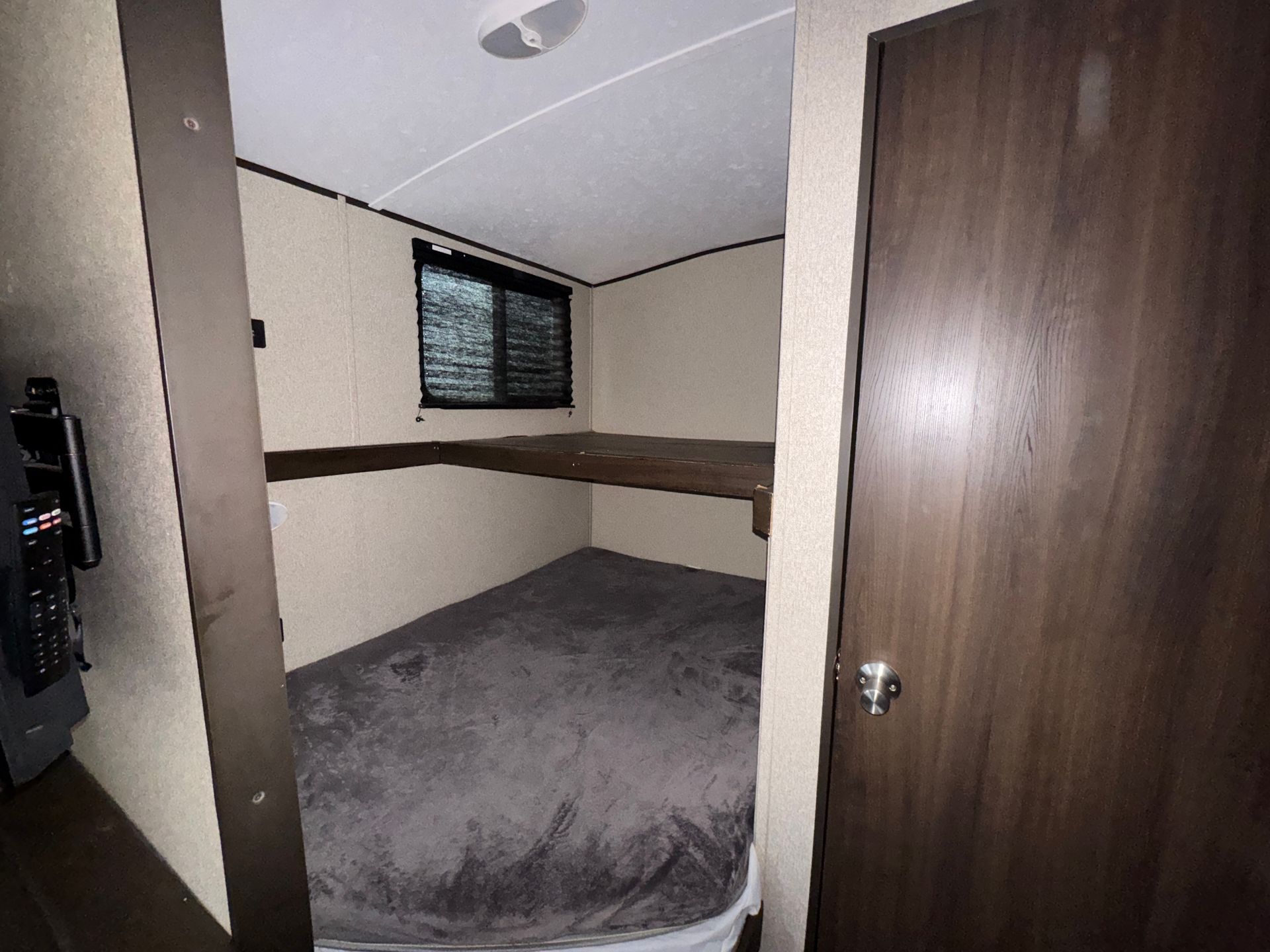 This 30-foot Keystone Bullet travel trailer is designed for both comfort and convenience. It features a private queen master bedroom and two full-size bunks, providing plenty of sleeping space. The full kitchen is equipped with everything you need, while the full bathroom ensures convenience on the road. A smart TV adds entertainment, making this the perfect setup for a mobile greenroom or getaway. Climate control keeps the space comfortable in any season.