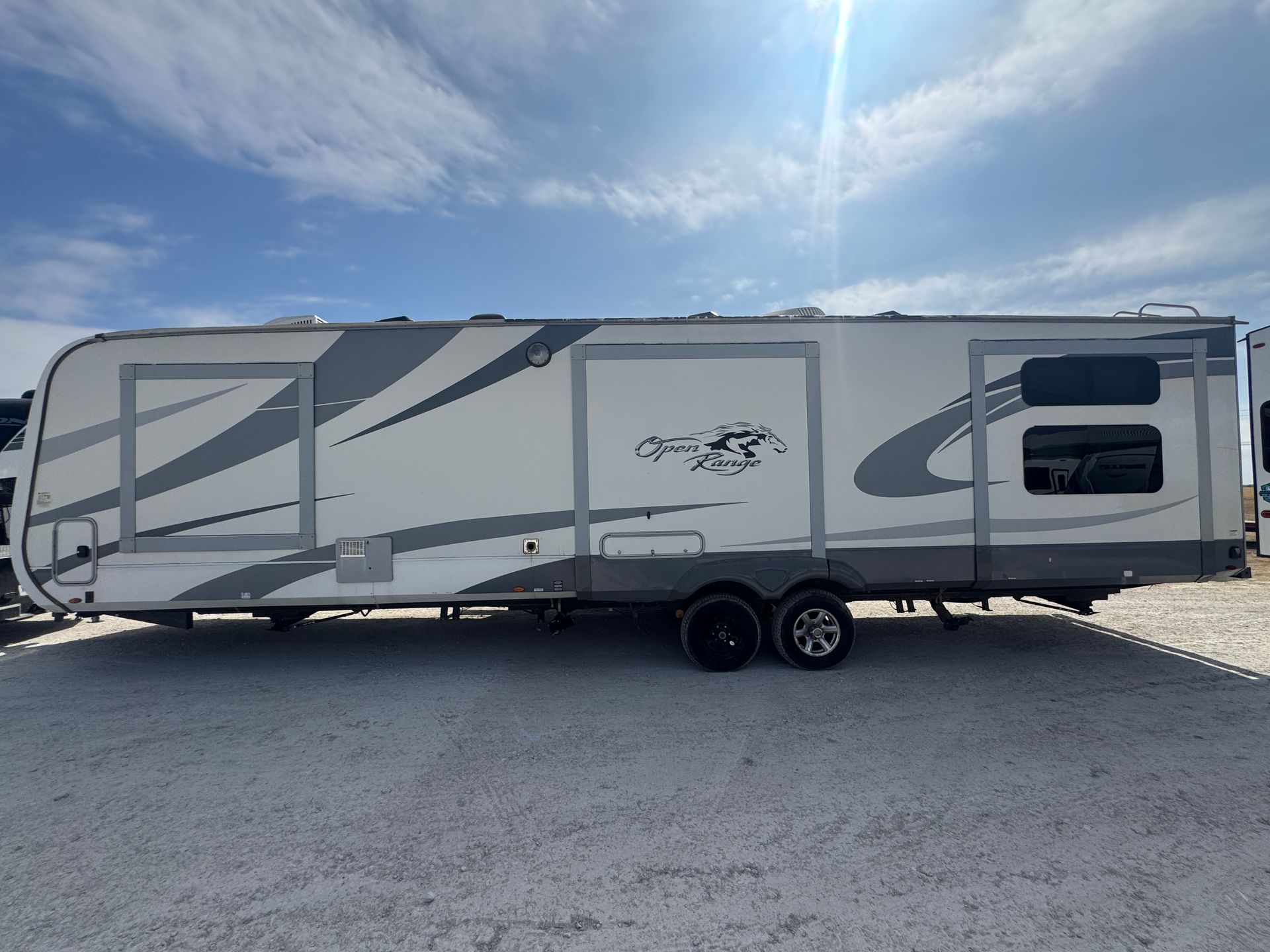 This 34-foot Longhorn open living trailer offers an expansive layout with three slide-outs for maximum space. The king master bedroom is designed for ultimate comfort and includes a washer and dryer for added convenience. The full kitchen and bathroom provide everything you need for long stays or short trips. Thoughtfully designed and well-maintained, this trailer is perfect for those seeking both comfort and practicality on the road.