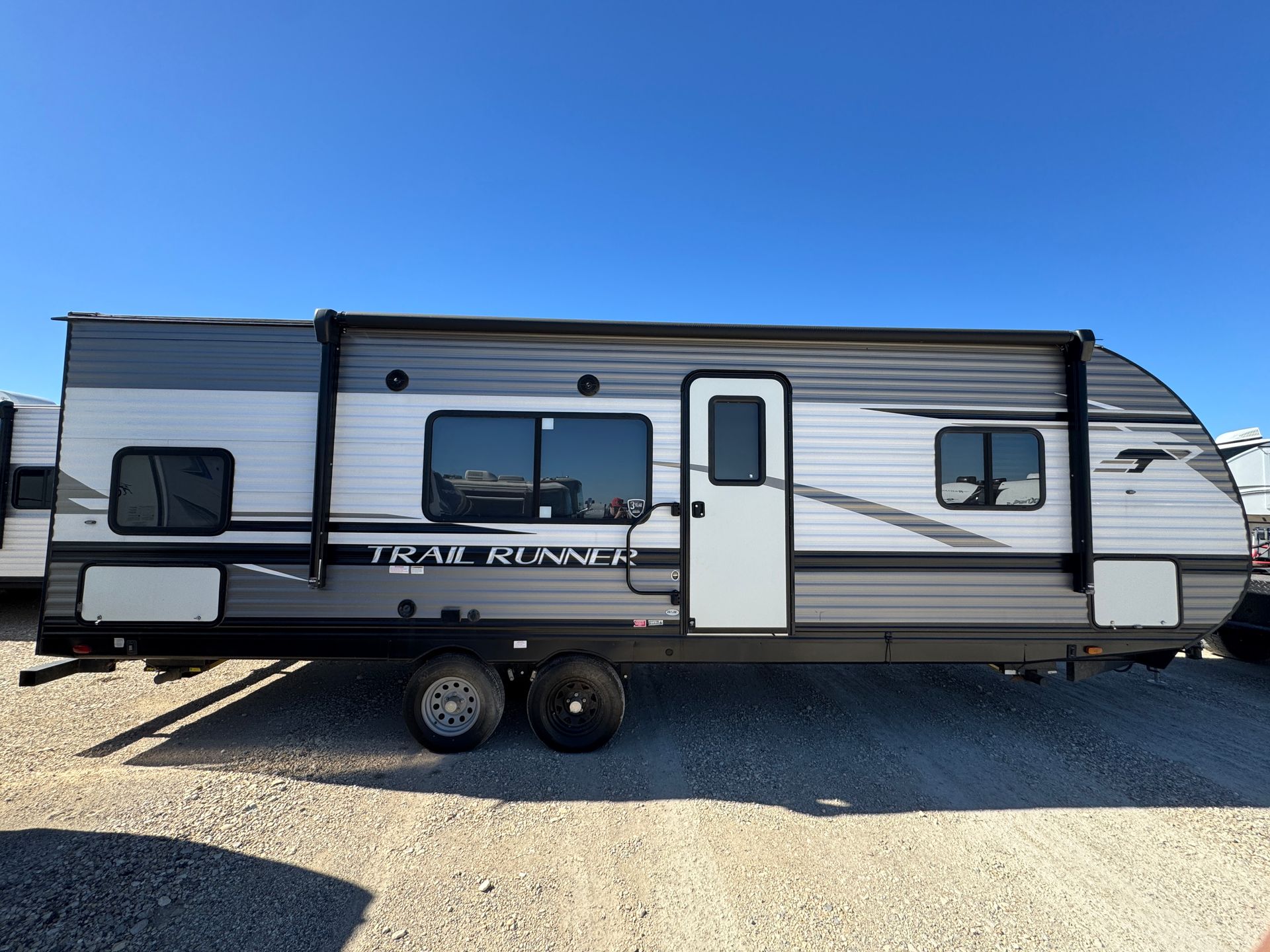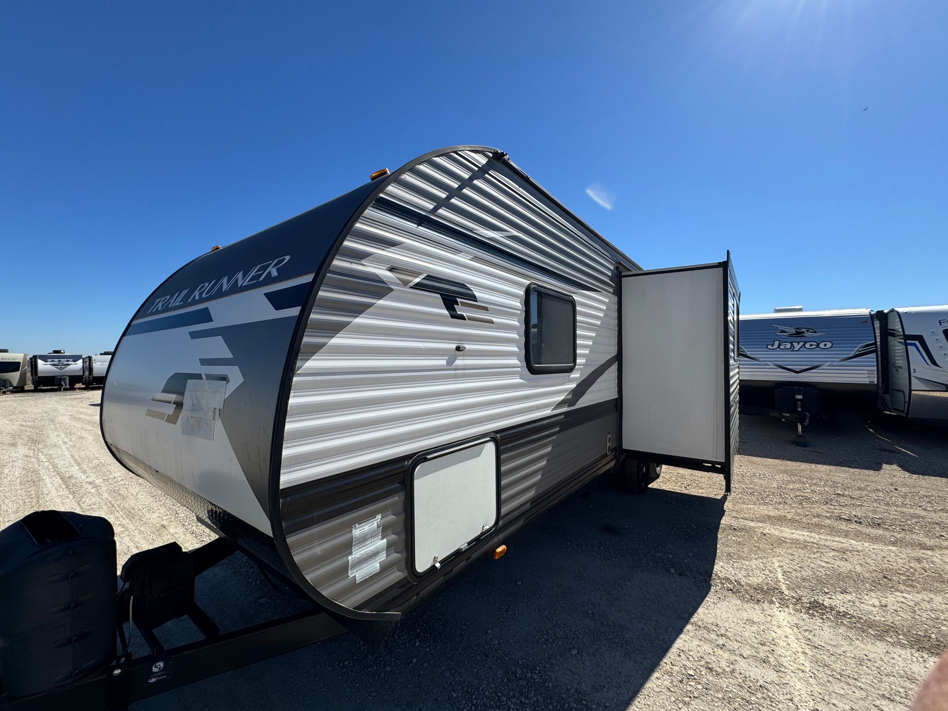 The 2021 Heartland Trail Runner 261JM comfortably sleeps up to eight, with a private front queen bedroom, double bunks and a slideout couch. A single slide-out opens the living space, while the fully equipped kitchen and full bathroom make trips easy. Comes with a 17′ power awning with LED lighting, pass-through storage, and an exterior shower. Durable construction and a practical layout make this trailer ideal for family adventures or group getaways.